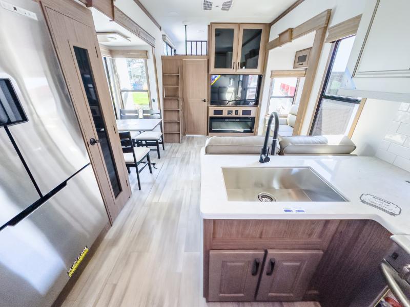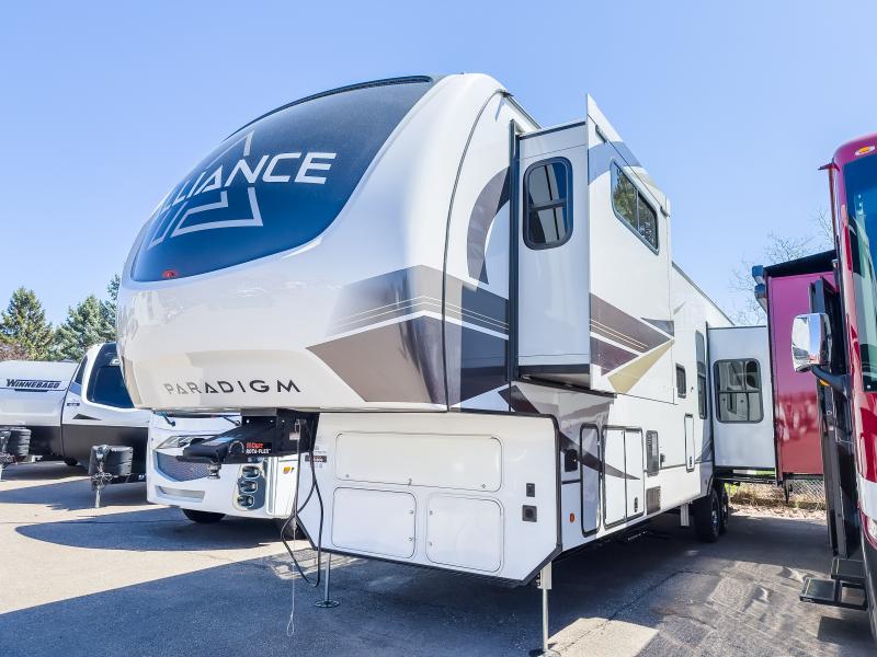 The Paradigm fifth wheels by Alliance RV are functional, high-quality, and luxurious for an unforgettable camping experience. There are three A/C units and a 40K BTU furnace to keep you comfortable year around, and you'll appreciate additional convenient amenities, like the all-in-one enclosed/heated utility center and the color coded and numbered wiring. A Rota-Flex pin box comes standard for hassle-free towing, along with Super-G 4,400 lb. rated tires and Dexter 7,000 lb. axles. You'll love the kitchen with its LG solid surface countertops and Insignia range, plus there is LED motion lighting in the pantry and a Maxx fan with a rain sensor to keep everything fresh when making dinner. Each model also includes an HD Smart TV in the living room and bedroom, plus a Winegard Air 360 antenna to keep you connected to the outside world. And of course there are a variety of options you can choose from to further customize your fifth wheel; dual pane windows, Super Solar Plus, slide out awning toppers, and generator prep or a generator to name a few!