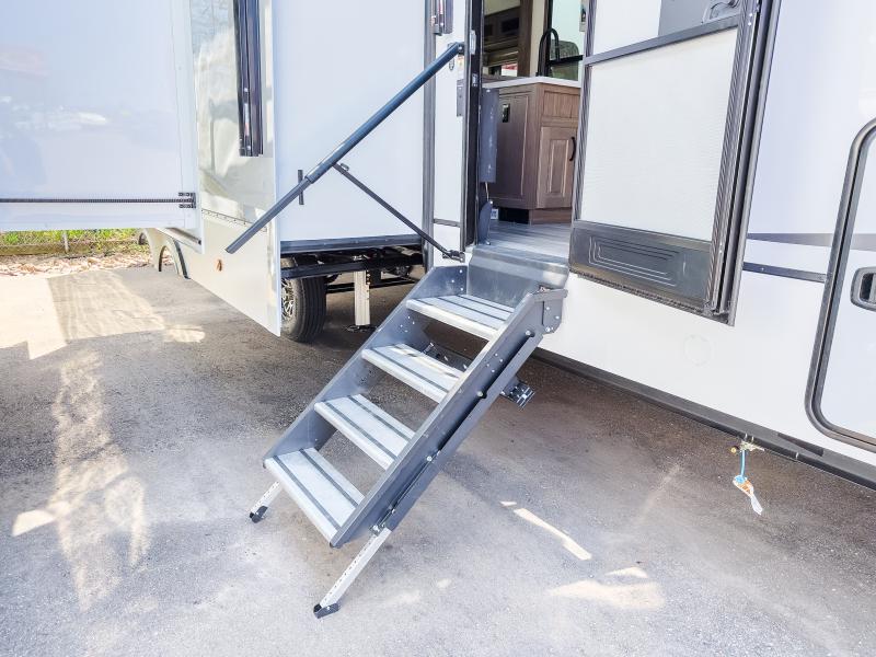 A spacious unit with sleeping for eight with plenty of choices to suit everyone! There is a front private bedroom with a king size bed that offers a large full front closet that has also been prepped for a washer and dryer if you choose that option. The front bath features a 40" x 30" shower and dual entry. Head down to the kitchen and living space at the bottom of the stairs to find a curbside slide that houses the 19 cu. ft. residential refrigerator, a pantry, and a dinette with four chairs. As you continue on toward the rear of this coach, you will find a spacious living area along the roadside with a 50" Smart TV and a fireplace, a sofa sleeper slide, and a dual reclining loveseat. This makes a great gathering place for television watching, game playing, and even added sleeping space if needed at night. The rear private bedroom with its own private bath features a queen bed, two closets, and a Smart TV as well. The multipurpose loft area above can be accessed just before this rear bedroom entry by a ladder, and it is perfect for extra storage, or it can be used for added sleeping that the kiddos are sure to love.