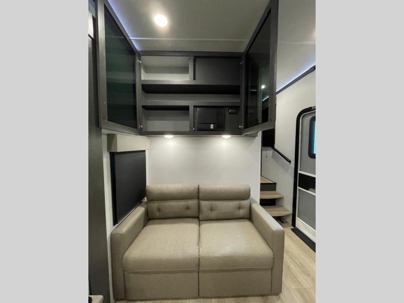 The toy hauler's garage area includes 13' of space for your toys, an air compressor, opposing HappiJac sofas with a queen bed above, and a half bathroom. The dual entry doors allow for easy access, and the chef in the family will appreciate the three-burner cooktop and ample counter space.