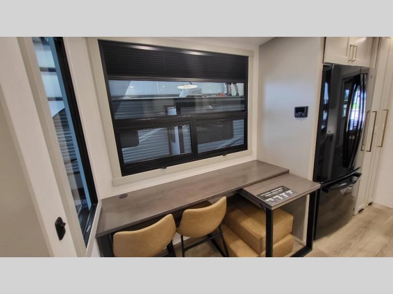 This toy hauler may just be the one you've been looking for! The garage/flex space with fold-away half bath walls will allow you to utilize the garage how you need it, plus there is an adjustable tie-down system, independent dual sofas, plus a loft for storage and a twin bed to sleep more campers! The garage patio with a 1,500 lb. capacity is another feature you are sure to love, especially with its own awning to keep you protected from the elements. Head to the kitchen to prepare meals with a 24" GE oven with a four burner range, a GE microwave with an air fryer, plus a spacious GE Energy Star 19 cu. ft. refrigerator. The island with two stools will let others visit with you while you cook, and there are even hidden dog bowls. You'll find the convertible dining table/L-desk will be accommodating since it can be use to dine at, and to get some work done. You may just find yourselves spending most of your time on the U-sofa in front of the TV and fireplace. A full bath is up front by the bedroom, and here you'll find neon shower lighting, a residential shower system, and pull-out linen storage to keep towels ready to use. After a day outdoors you'll love nothing more than coming back to your own bedroom with a king bed slide out, TV, a walk-in closet, and many more storage spaces. And we haven't even touched on the exterior features, like the 3-way pass-through storage, three power awnings, an air compressor to fill up tires, and the list goes on and on! This is a pre-production preview, all features and layout placement subject to change.