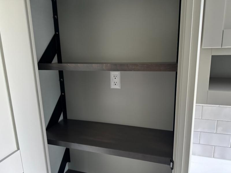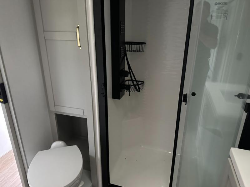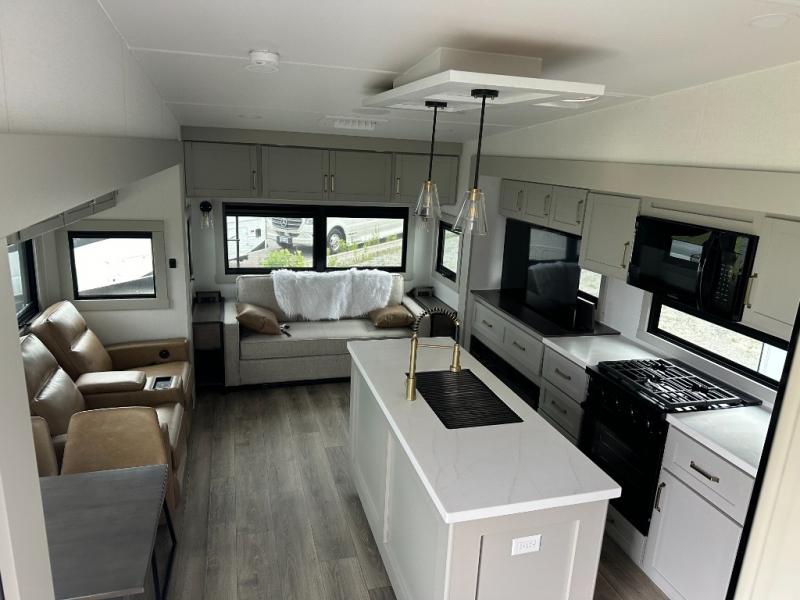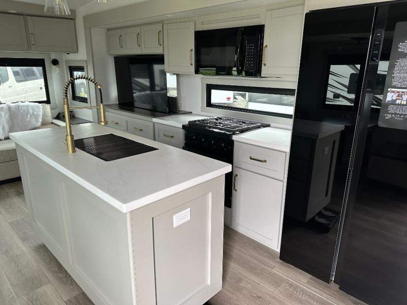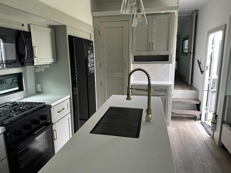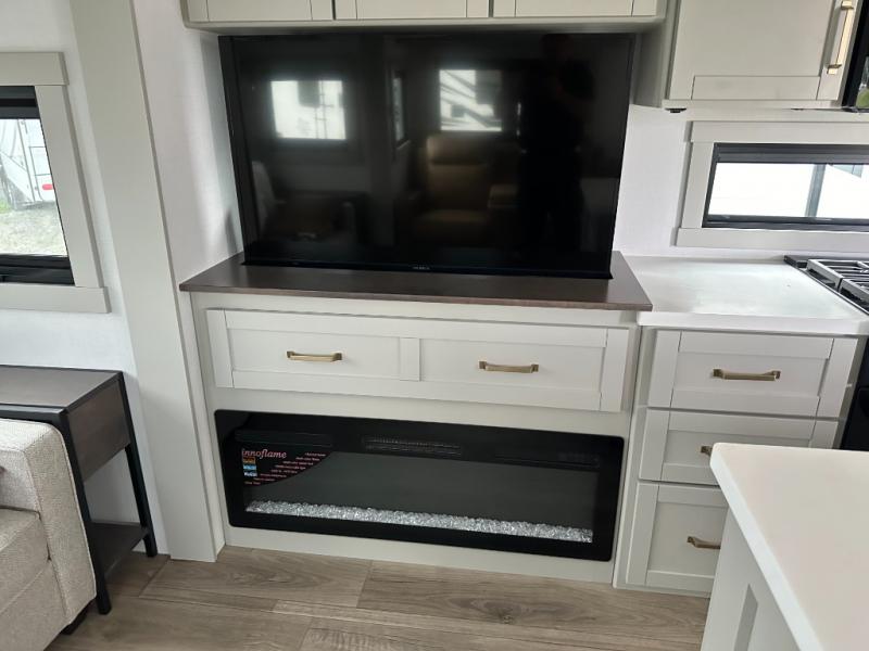 You're going to love every minute spent in this spacious fifth wheel that can sleep four. There is an inviting rear living area with a 72" tri-fold sofa and theater seating across from the telescoping entertainment center and fireplace. The chef of your group can whip up dinner on the three burner cooktop or in the 30" residential microwave, and there is a 16 cu. ft. refrigerator that even opens when with the slide out is in. You will also enjoy the kitchen island with a farmhouse sink and roller cover, dual trash bins with a Stow N' Go paper towel holder, plus convenient dog bowls for your furry friends. You can store all your paper goods and snacks in the 84" pantry with adjustable shelving, and there is a hutch for nice dishes plus shoe storage in this model as well. Head to the front master bedroom where you'll find a queen bed with a TV, a large slide out with a wardrobe and a chest of drawers, plus a spacious bath.