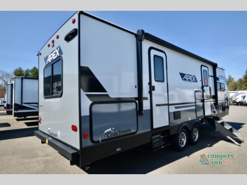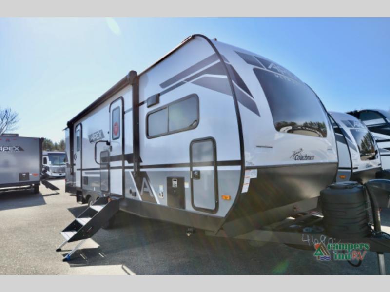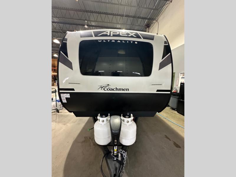 Lightweight living and camping is found with the Apex Ultra-Lite travel trailers by Coachmen. These eco-friendly units are made to last thanks to the Azdel composite sidewalls, the laminated aluminum floor, and the vacuum-bonded laminated crowned roof. Easy lube axles make towing easier than ever, plus there is a friction hinge entrance door, a 200-watt solar panel with a 30 Amp control charger, and slam latch baggage door catches for easy unloading. Some of the interior comforts you'll fall in love with are the one-piece seamless edge countertops, the hard valances with night shades, the matte black hardware, and the Casino Bisque cabinetry. The Apex Ultra-Lite trailers also include USB ports, a digital TV antenna with cable hook-ups and Wi-Fi capability, and a 13.5K BTU A/C to keep you comfortable all summer long!