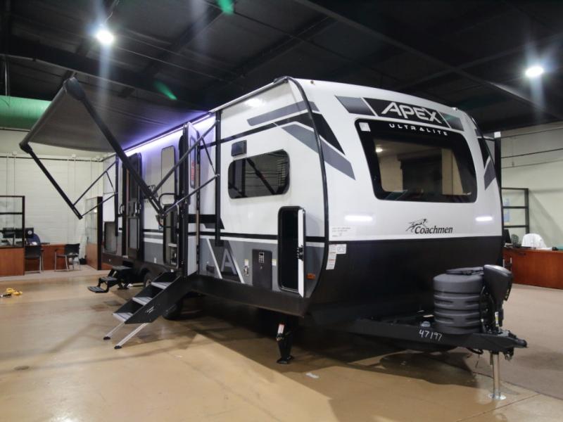 The Apex Ultra-Lite series by Coachmen RV is built with quality materials like Azdel composite sidewalls, a laminated aluminum floor, and a vacuum-bonded crowned roof for enhanced strength and longevity. Easy lube axles, a 200-watt solar panel, and slam latch baggage doors make setup and travel seamless.