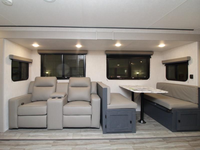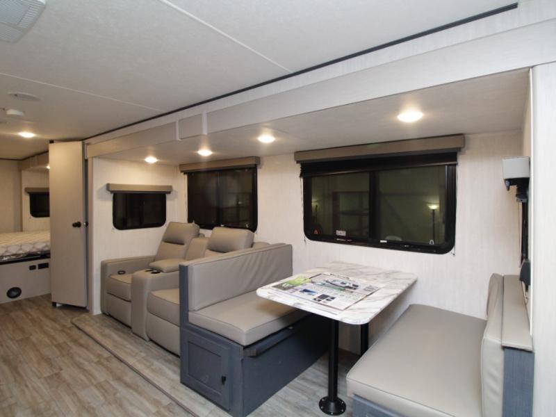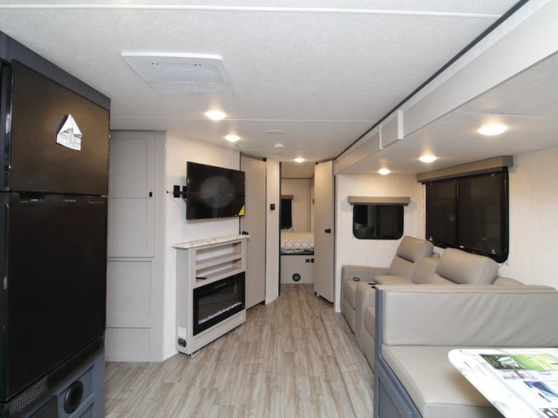 Inside, you'll appreciate the seamless edge countertops, Casino Bisque cabinetry, matte black hardware, and hard valances with night shades. Stay connected with USB ports, a digital TV antenna with cable and Wi-Fi capability, and enjoy year-round comfort with a 13.5K BTU air conditioner.