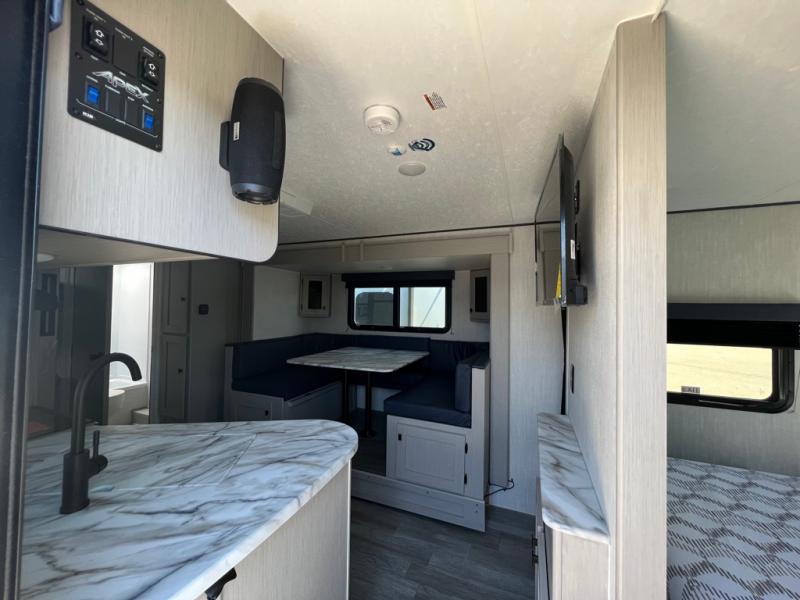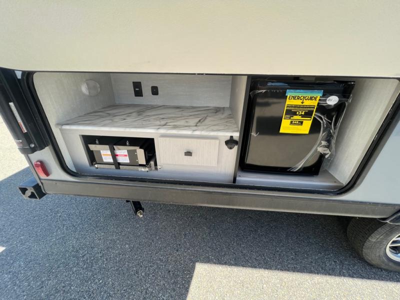 Double-size bunks make any camping trip fun, so pack your bags and head out! When you arrive at the campground you can make a quick lunch on the outdoor camp kitchen, and unload the exterior pass-through storage. A fully-equipped kitchen indoors includes a three burner cooktop, a microwave oven, plus a stainless steel sink with a flush-mount cover for added counter space. You will love having your own full bath on board, as well as a front bedroom with a queen bed and dual wardrobes.