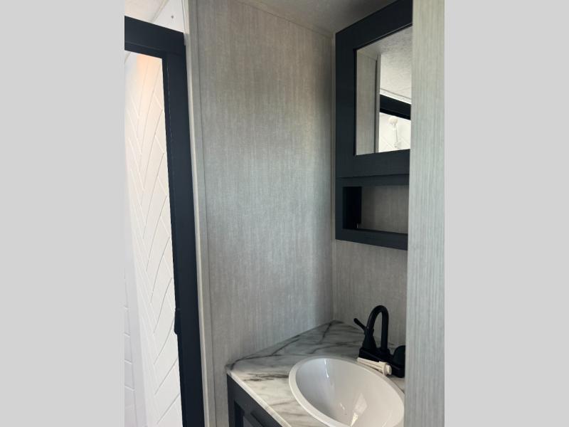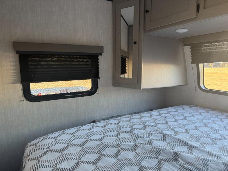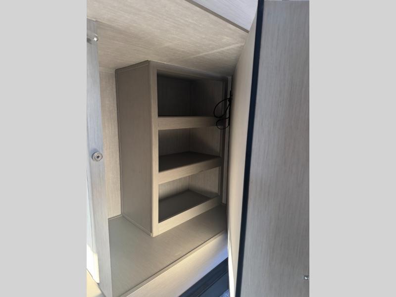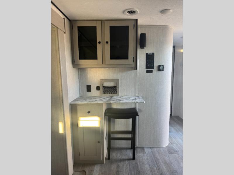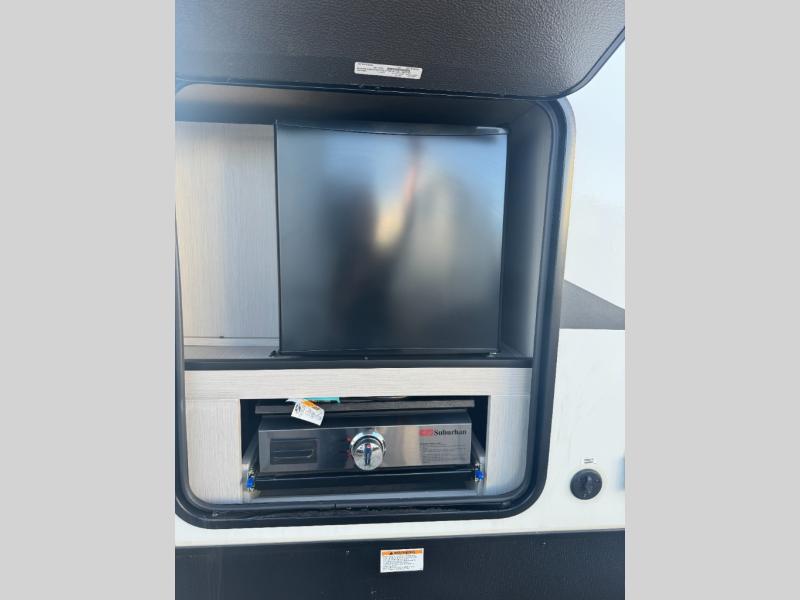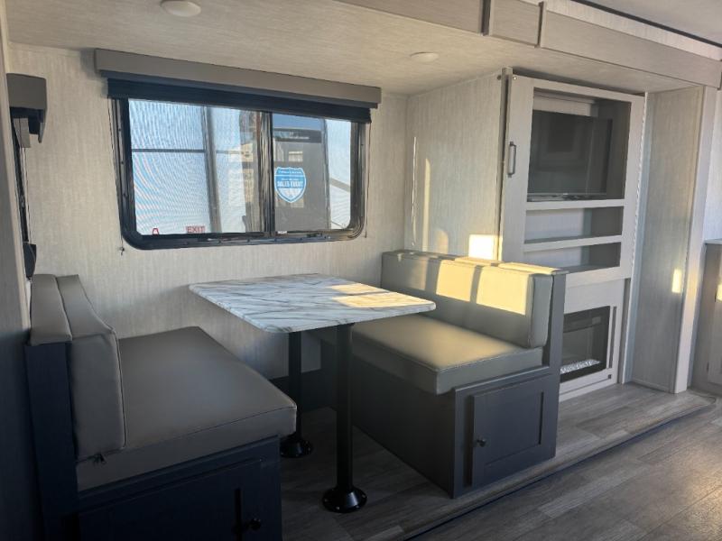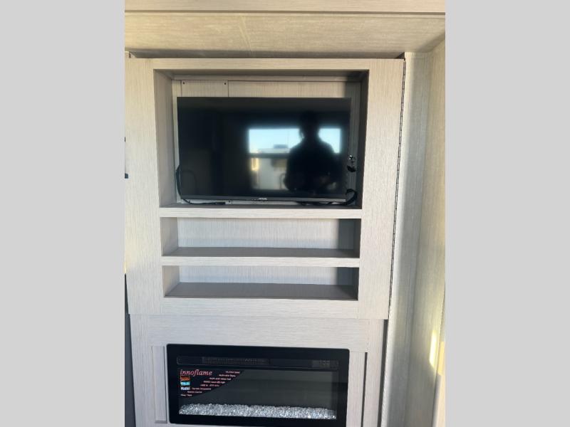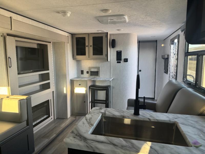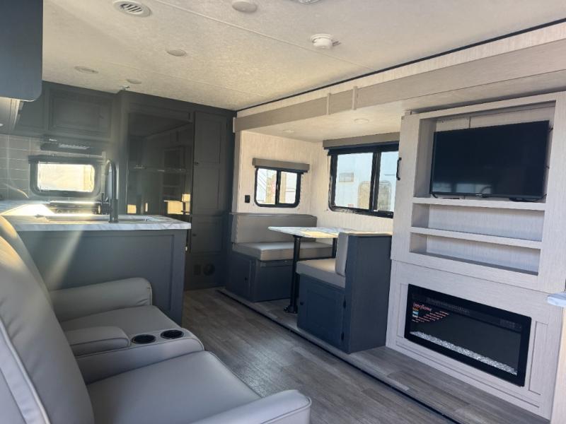 This rear kitchen travel trailer is perfect for weekend camping trips at your favorite state park. You will love the U-shaped kitchen counter space plus a countertop extension to prep meals with ease. An 8 cu. ft. 12V refrigerator and pantry will keep food fresh, and there is even an outside kitchen the chef is sure to love! You can relax on the sofa across from the entertainment center and fireplace, play a game at the booth dinette, or get some work done at the desk. The full bath will let you clean up each day and the front private bedroom will feel just like home. There is a queen bed here, along with dual wardrobes on either side of the bed plus a third bedroom wardrobe to keep clothes tidy!