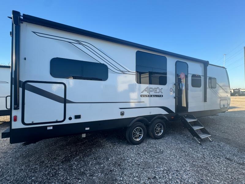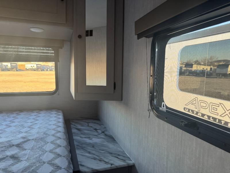 Lightweight living and camping is found with the Apex Ultra-Lite travel trailers by Coachmen. These eco-friendly units are made to last thanks to the Azdel composite sidewalls, the laminated aluminum floor, and the vacuum-bonded laminated crowned roof. Easy lube axles make towing easier than ever, plus there is a friction hinge entrance door, a 200-watt solar panel with a 30 Amp control charger, and slam latch baggage door catches for easy unloading. Some of the interior comforts you'll fall in love with are the one-piece seamless edge countertops, the hard valances with night shades, the matte black hardware, and the Casino Bisque cabinetry. The Apex Ultra-Lite trailers also include USB ports, a digital TV antenna with cable hook-ups and Wi-Fi capability, and a 13.5K BTU A/C to keep you comfortable all summer long!