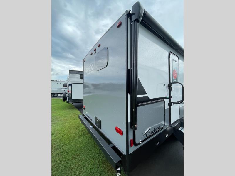 Lightweight living and camping is found with the Apex Ultra-Lite travel trailers by Coachmen. These eco-friendly units are made to last thanks to the Azdel composite sidewalls, the laminated aluminum floor, and the vacuum-bonded laminated crowned roof. Lippert axles and nitrogen filled radial tires make towing easier than ever, plus there is a friction hinge entrance door, a 100-watt solar panel with a 10 Amp control charger, and slam latch baggage door catches for easy unloading. Some of the interior comforts you'll fall in love with are the one-piece seamless edge countertops, the hard valances with night shades throughout, the matte black hardware, and the residential comforter. The Apex Ultra-Lite trailers also include USB ports, a digital TV antenna with cable hook-ups and Wi-Fi capability, and an AM/FM stereo with Bluetooth to ensure you'll never be bored on rainy camp days!