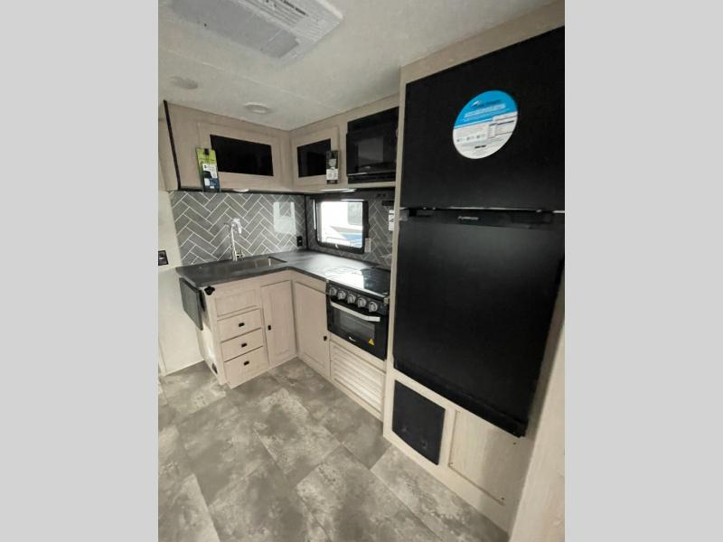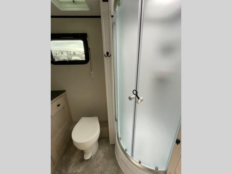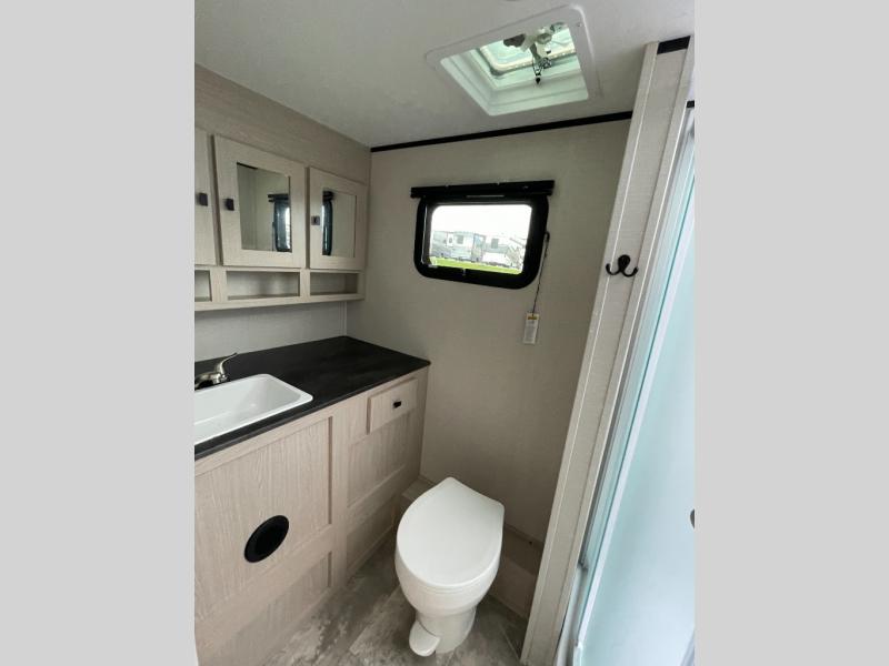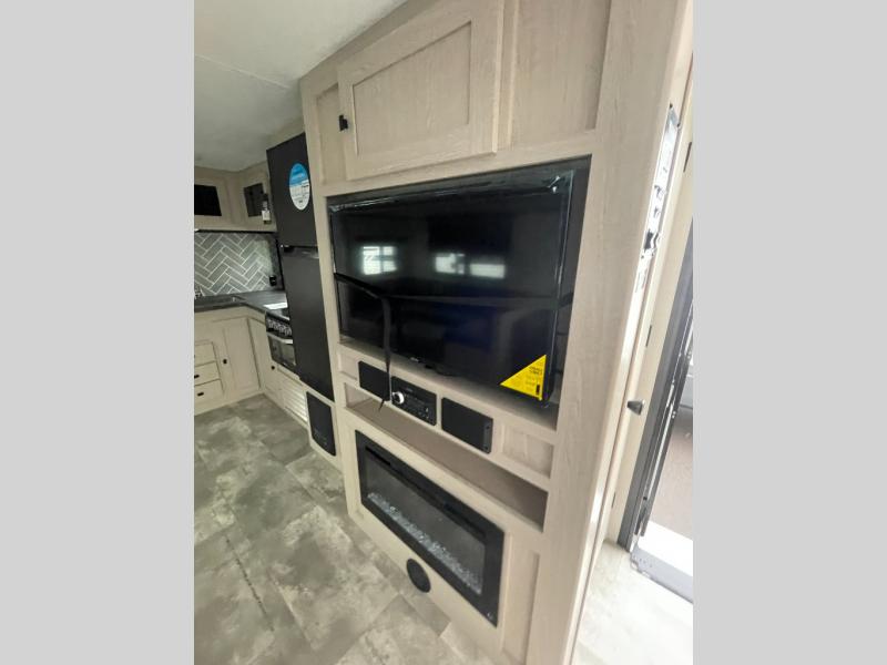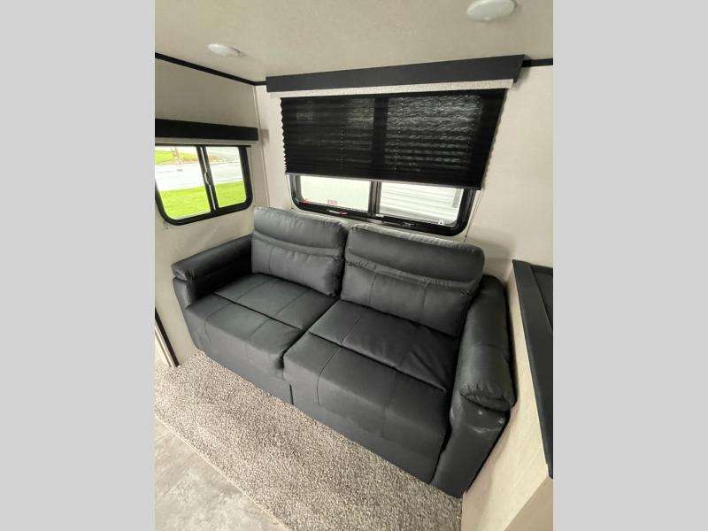 You won't be roughing it on camping trips with this spacious travel trailer. Once you arrive at the lake, make a quick lunch on the exterior camp kitchen, set up the 18' power awning, then grab the fishing poles from the pass-through storage! When you get back from fishing you can clean up in the full rear bath, then relax on the sofa or play a game around the U-shaped dinette. You will love the amount of storage space you have in this trailer with plenty of overhead cabinets, dual bedroom wardrobes, plus an entryway walk-in closet with shelves for jackets, food, and shoes!