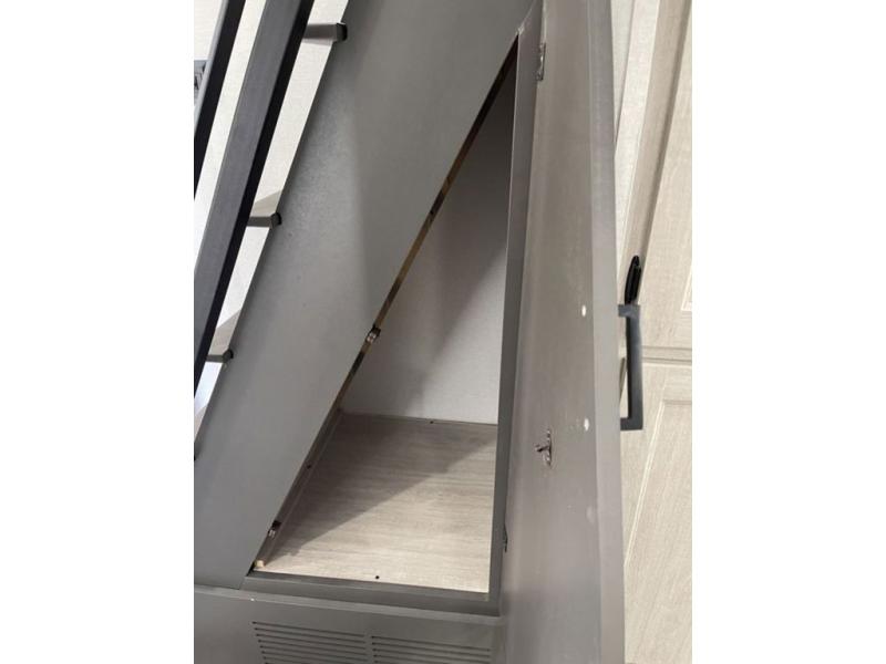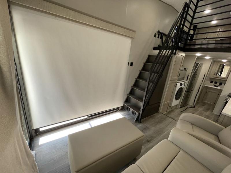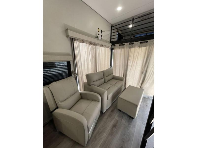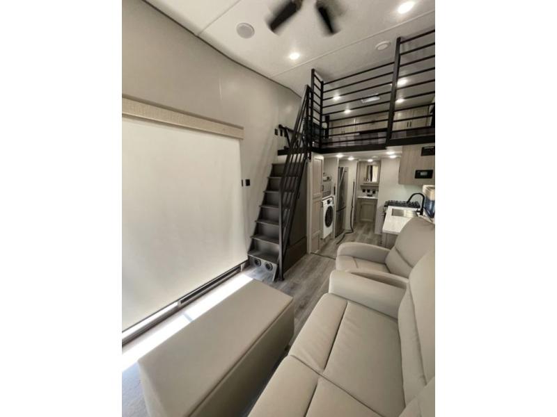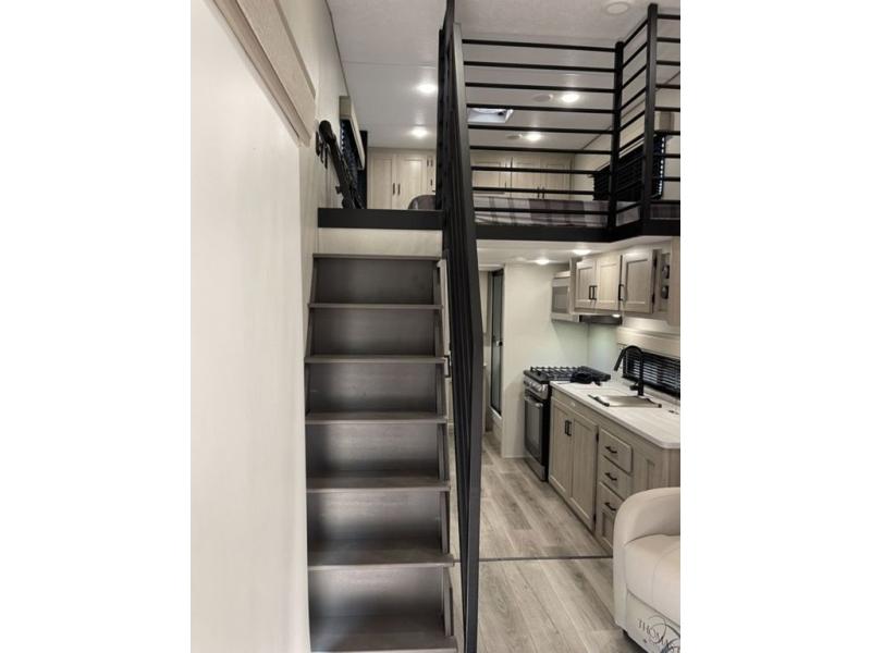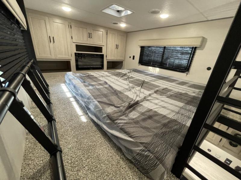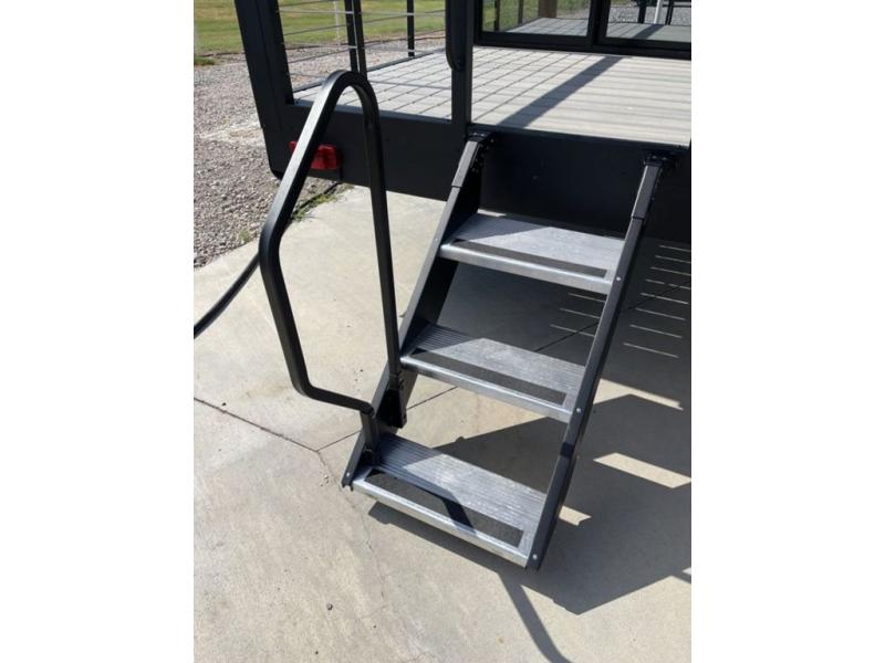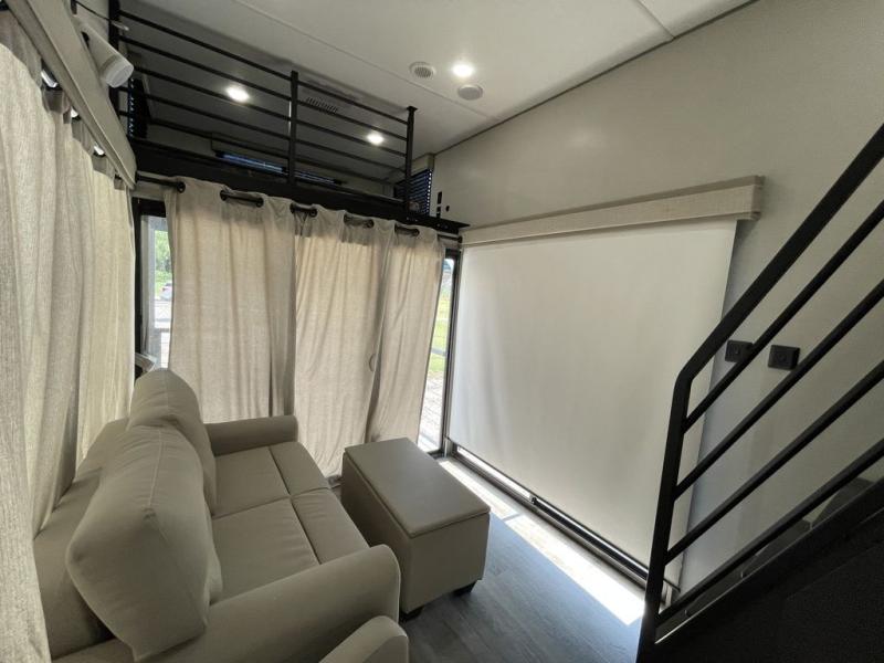 If you are looking for the ultimate camp experience you are going to love this double loft unit with a view! A 180 degree view from inside the front portion with large windows on each side and a full glass front patio door to an outside covered porch with composite decking for years of easy maintenance. Above the covered porch inside, there is a removeable ladder to the front loft space with a queen bunk matt for sleeping. A staircase to the rear master loft allows for storage under the stairs, and the master loft features a king bed mattress, electric fireplace, and plenty of storage for your things. There are also nice views from both lofts. The living room and kitchen feature all of the necessities to be comfortable. A tri-fold sofa and recliner for relaxing, and an ottoman also has a hinged lift table for dining. The kitchen features all of the appliances needed to create meals and snacks just like at home including a residential refrigerator for your perishables. The rear bath offers privacy and a nice size shower, toilet, and plenty of storage for towels and toiletries. Your family is sure to love this double loft unit!