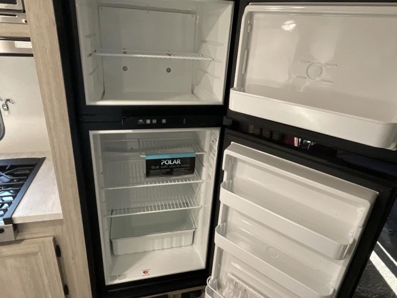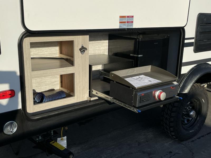 Find adventures with seven of your closest friends or family in this Catalina Expedition trailer. There are double bed bunks with storage beneath the lower bed inside, and a camp kitchen outside featuring a refrigerator and griddle plus storage. You can also cook inside with a two burner cooktop and microwave oven, plus 10.7 cu. ft. GE stainless refrigerator as well. The versatile queen Murphy folds up into the front wall providing a 68" jackknife sofa during the day giving you lots of options for seating and relaxing without having to add to your tow length. Dual nightstands are a perfect spot to drop your phones for the night or a book to read, and the rear corner bath features a tub/shower, toilet, and sink with medicine cabinet so all can easily get cleaned up each morning or night. There is also an outside shower so that you can rinse off after a fun day hiking and kayaking before heading inside. There is also a large pass-through storage compartment that will easily fit all of your extra gear, outdoor games, rafts, and camp chairs, plus so much more. Don't forget to throw on your bike, with the convenient bike carrier in front!