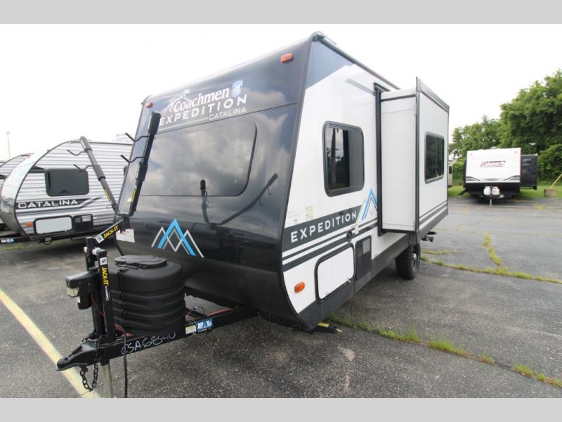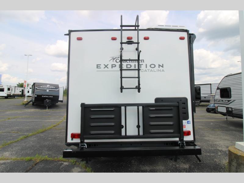 With any Catalina Expedition travel trailer by Coachmen, you will have a lightweight RV that was built with a cambered structural steel l-beam frame, a seamless Alpha roof membrane, fiberglass insulation throughout. There are oversized off-road fender flares, all terrain tires, and a premium exterior graphics package. On the outside, an electric awning includes a multicolor LED strip with a remote offering a covered outdoor living area that can be utilized during the day or night, plus a multizonal JBL premium exterior speaker to listen to tunes. The interior provides Congoleum woodplank linoleum flooring, seamless Thermofoil countertops throughout, hard valance window treatments, and so much more! It's time to start your expedition!