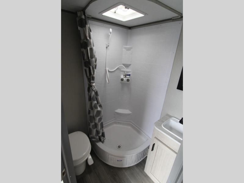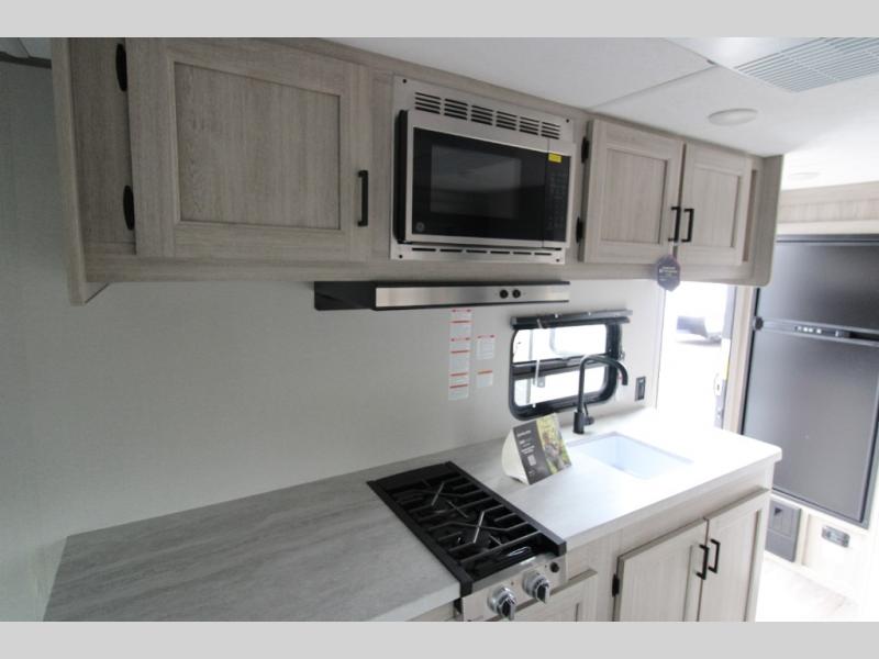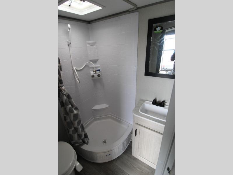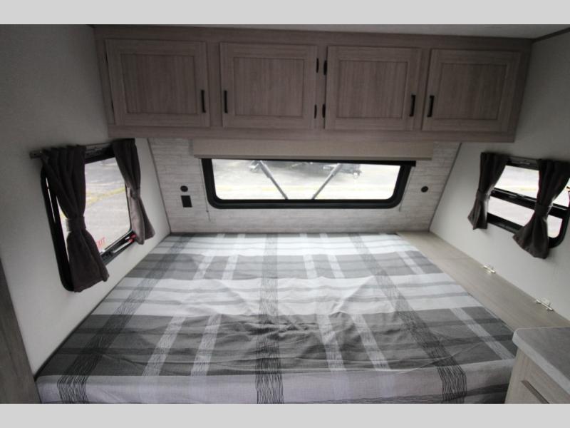 Get ready for adventure either at a local RV park or off-grid as you enjoy the outdoors. You will be able to return to your own accommodations in this trailer with a spacious interior thanks to the single slide that offers more elbow room and floor space to move about, and plenty of space to stretch your legs, and dine. The sofa slide is great for an overnight guest or two small children to sleep on. Spend your days outside swimming at the lake or hiking trails to return to a rear corner bath with a 32" x 32" radius shower that will allow you to get cleaned up before bed. You will find an RV queen bed in front with a countertop at the foot of the bed which is a perfect spot to drop your phones for the night or stash your reading material, alarm clock and/or purse/wallet. This model also includes a heavy-duty table to use indoors or outdoors!