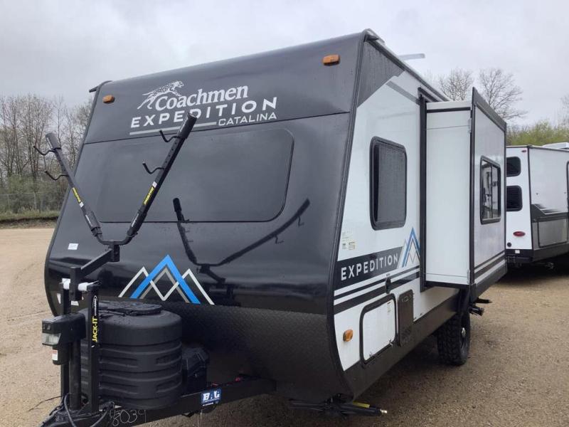 With any Catalina Expedition travel trailer by Coachmen, you will have a lightweight RV that was built with a cambered structural steel l-beam frame, a seamless Alpha roof membrane, fiberglass insulation throughout. There are oversized off-road fender flares, all terrain tires, and a premium exterior graphics package. On the outside, an electric awning includes a multicolor LED strip with a remote offering a covered outdoor living area that can be utilized during the day or night, plus a multizonal JBL premium exterior speaker to listen to tunes. The interior provides Congoleum woodplank linoleum flooring, seamless Thermofoil countertops throughout, hard valance window treatments, and so much more! It's time to start your expedition!