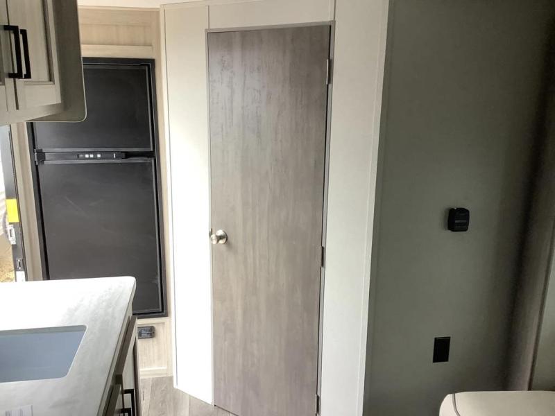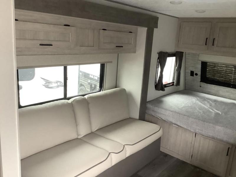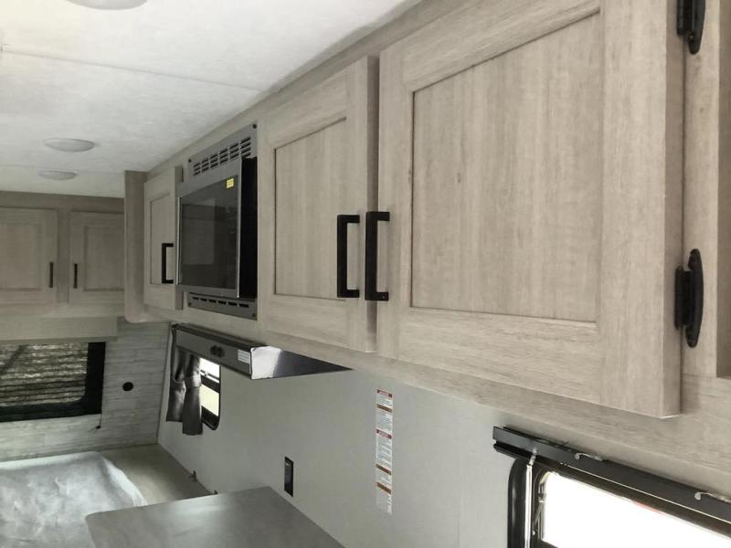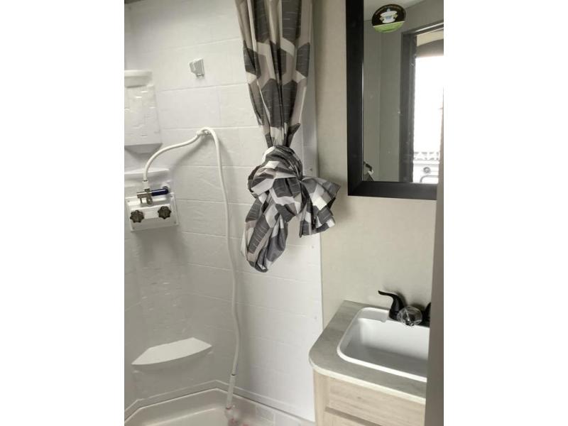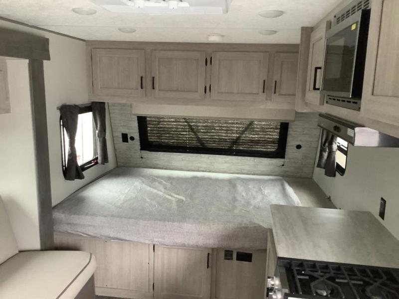 Get ready for adventure either at a local RV park or off-grid as you enjoy the outdoors. You will be able to return to your own accommodations in this trailer with a spacious interior thanks to the single slide that offers more elbow room and floor space to move about, and plenty of space to stretch your legs, and dine. The sofa slide is great for an overnight guest or two small children to sleep on. Spend your days outside swimming at the lake or hiking trails to return to a rear corner bath with a 32" x 32" radius shower that will allow you to get cleaned up before bed. You will find an RV queen bed in front with a countertop at the foot of the bed which is a perfect spot to drop your phones for the night or stash your reading material, alarm clock and/or purse/wallet. This model also includes a heavy-duty table to use indoors or outdoors!