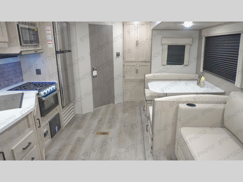 This half-ton friendly trailer is easy to pull and park, and is spacious thanks to the large slide out in the main living and kitchen area! You can dine at the booth dinette or choose the free standing dinette option, and the sofa offers drink holders for when you are watching the entertainment center with the optional fireplace below. The rear corner offers a full bathroom, and a large wardrobe/pantry for the storage you need. The galley kitchen offers full amenities plus a breakfast bar where you can set out fresh fruit and cereal. And the 15' awning provides protection from the elements plus has the choice of multiple LED colors with the use of the remote.