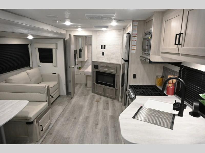 When you enjoy camping with your own accommodations and space for the whole crew, hitch this trailer up and head to the campgrounds! After loading everything easily thanks to the dual entry doors and all the interior and exterior storage, you will have no worries that you left anything behind. The electric awning is easy to set up, like the large slide out, and the awning offers multicolor LED lights to choose from by using the remote. When you are outside the cook might like to make a meal using the outside camper kitchen. The interior kitchen offers full amenities including a pantry, and everyone can enjoy the angled entertainment center. There are double-size bunks with a ladder for the kids and a walk-around queen for the owner to sleep on, plus furniture in the living area that doubles as additional sleeping space!