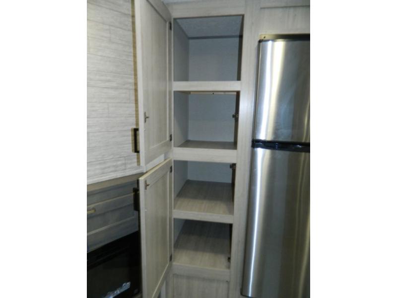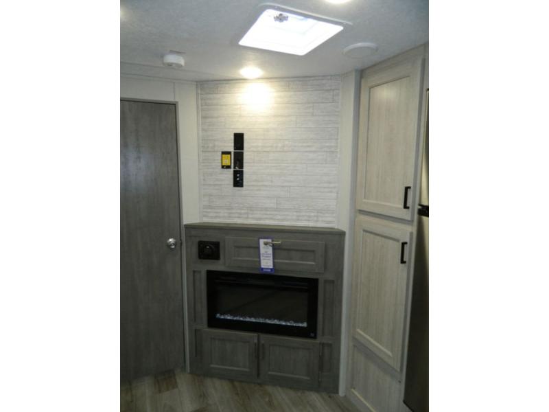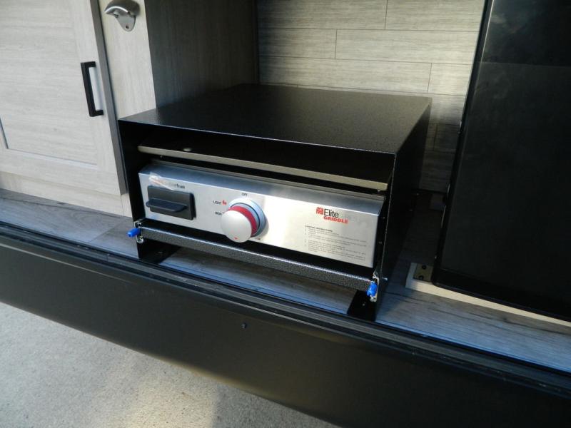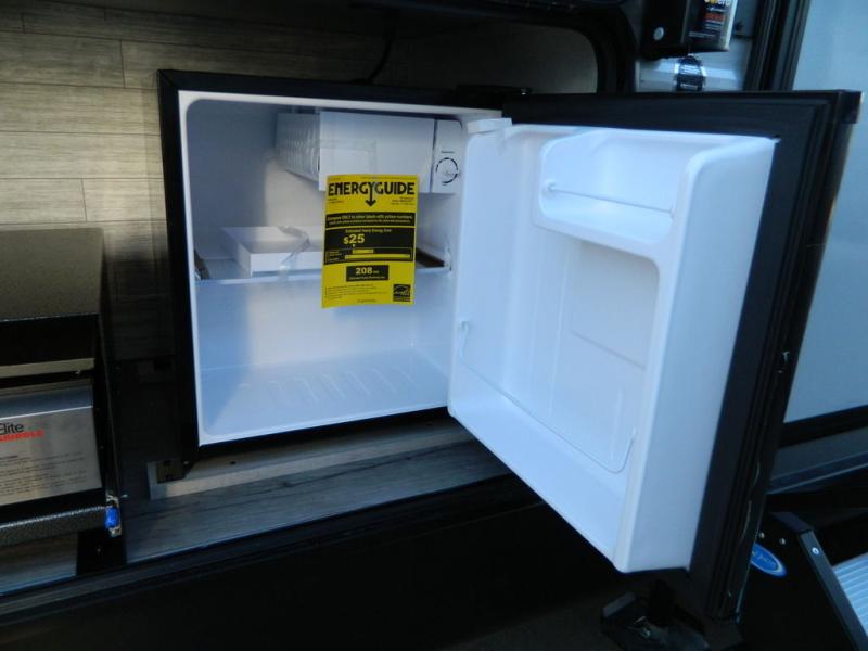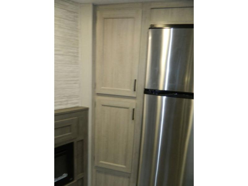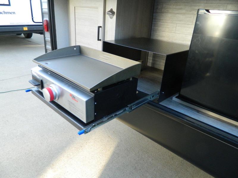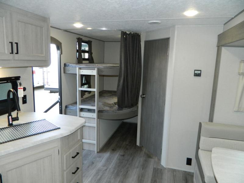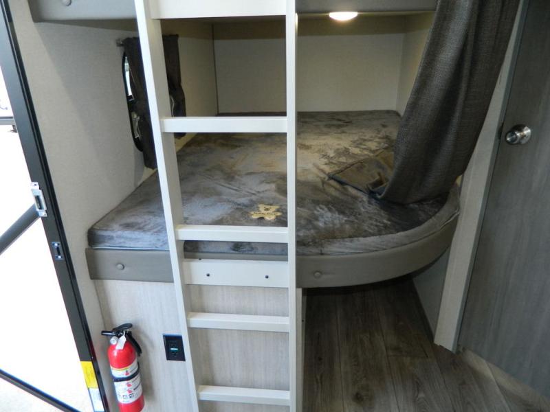 When you enjoy camping with your own accommodations and space for the whole crew, hitch this trailer up and head to the campgrounds! After loading everything easily thanks to the dual entry doors and all the interior and exterior storage, you will have no worries that you left anything behind. The electric awning is easy to set up, like the large slide out, and the awning offers multicolor LED lights to choose from by using the remote. When you are outside the cook might like to make a meal using the outside camper kitchen. The interior kitchen offers full amenities including a pantry, and everyone can enjoy the angled entertainment center. There are double-size bunks with a ladder for the kids and a walk-around queen for the owner to sleep on, plus furniture in the living area that doubles as additional sleeping space!