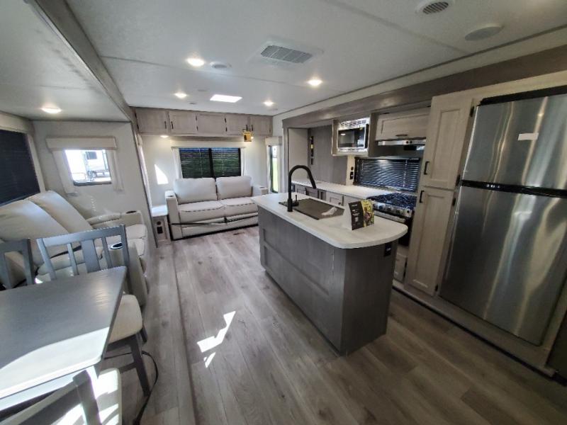 It's not hard to find comfort in this travel trailer with its triple slides, two lounge chairs, and spacious full bath. Once your crew is settled and unpacked, head outdoors to relax under the two power awnings with multicolored LED lights, or grab the fishing poles from the exterior storage and head to the water. If you'd rather spend your day inside you'll find all the comforts of home; dual lounge chairs, a sofa and booth dinette, plus a fully equipped kitchen, complete with a kitchen island! You will love having your own space in the front bedroom that includes a queen bed slide out, a dresser, plus two closets. There is even washer and dryer prep if you plan to go full-time!