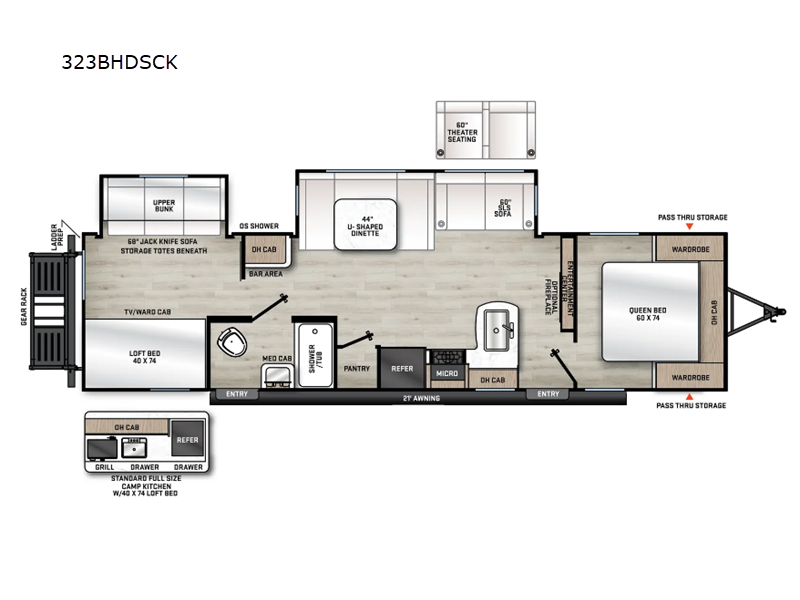 When you enjoy hiking, biking, and fishing, and waking up to beautiful scenery from your own comforts, then start camping with this trailer at the campsite! You will be able to sleep like royalty on the walk-around RV queen bed with dual wardrobes and overhead storage for more items in the front private bedroom. Your family or friends will have their own privacy in the bunkhouse complete a jack knife sofa with an upper bunk and storage totes below, a loft bed, and a TV/wardrobe cabinet. The full bathroom includes the second entry/exit door for convenience when outside under the 21' electric awning with multicolor LED lights, or while cooking using the full size camper kitchen along the exterior. There are full kitchen amenities inside including a 10.7 cu. ft. GE stainless 12V refrigerator and a pantry.
