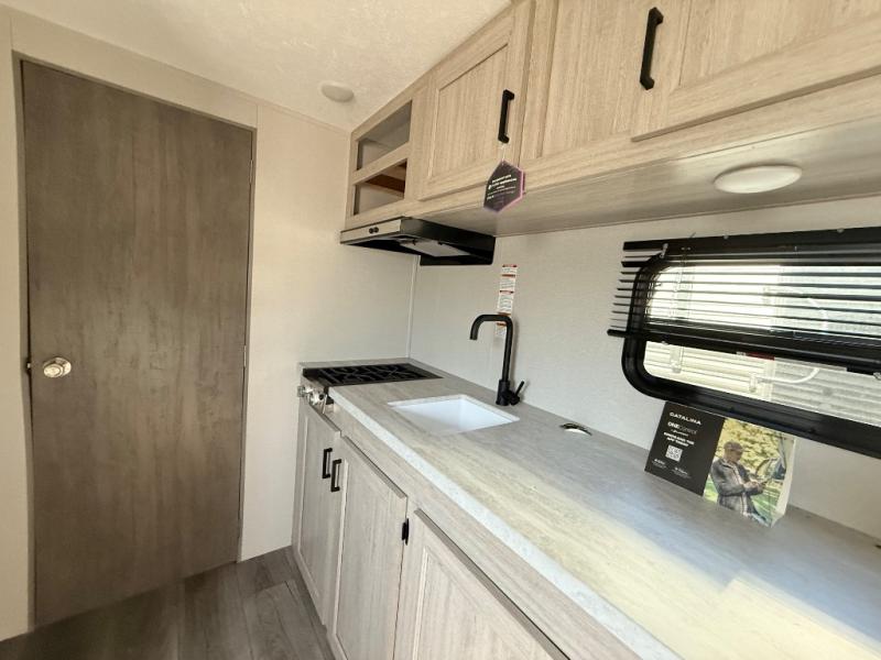 With any Catalina Summit Series 7' by Coachmen RV, you can create an easier adventure with the versatility and simplicity of the shorter lengths and lighter weights! Each includes a premium exterior graphics package, a smooth HD aluminum radius front, and Dexter EZ lube axles with leaf spring suspension. The exterior offers a heavy-duty standard tongue jack, a diamond plate rock guard to protect against road debris, exterior RG-6 coax cabling and satellite prep, rear view camera prep, and flush mount baggage doors with radius corners for your outdoor gear. Inside, you will enjoy premium JBL interior speakers, USB charging ports, seamless Thermofoil countertops throughout, a deep basin farm style sink for easy cleanup, and GE kitchen appliances. It's time to choose an affordable and maneuverable single axle trailer today!