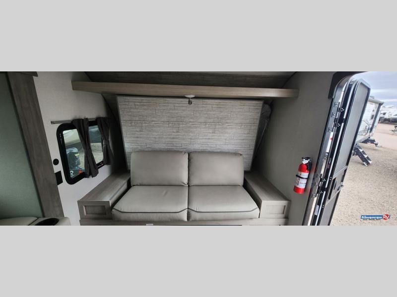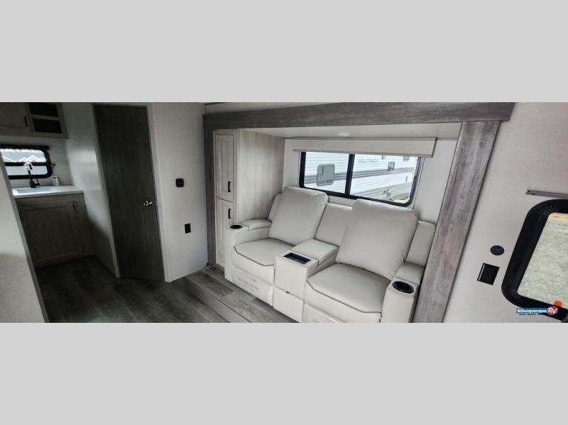 You will love the versatility of this trailer thanks to the Murphy bed and camper kitchen! During the day, with the Murphy bed folded up, you will have plenty of relaxing space with a 60" Jackknife sofa including overhead storage for your things. There is also a slide with theater seating, and a bar top to the left of the entry door with two stools. A rear corner kitchen features everything you need to cook indoors, or you can head outside to use the outdoor Camper Kitchen with mini fridge and griddle. A rear corner bath features a 24" x 32" shower, toilet and sink, plus linen storage as well. Outside, you'll find a 15' power awning with multicolor LED lights and exterior storage for camp gear.