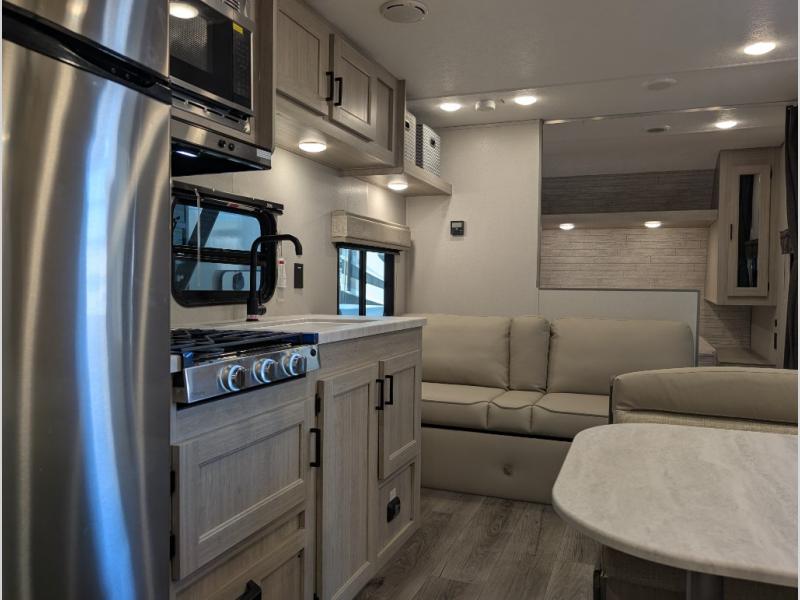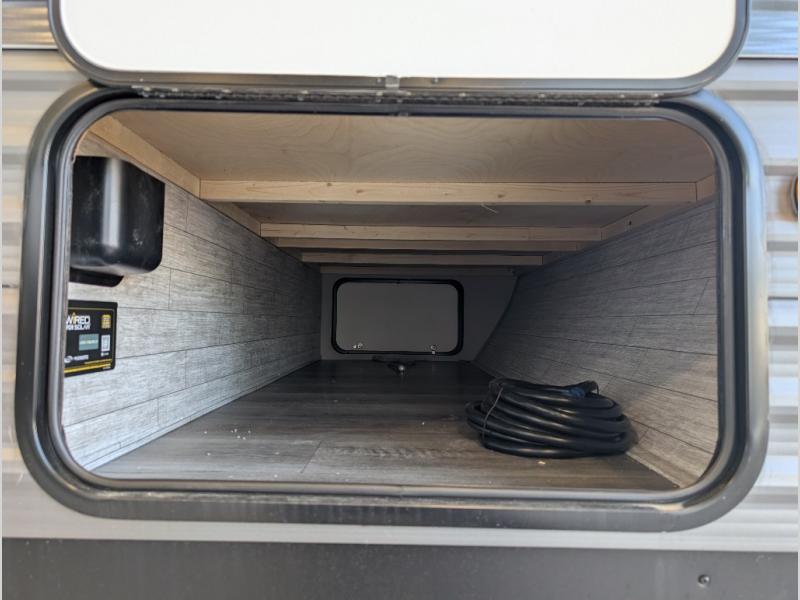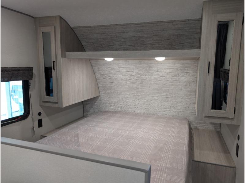 You get to choose to sit at the sofa or at the booth dinette when you are relaxing inside. There is a shelf with storage totes above the sofa for your belongings, and an additional overhead cabinet above the dinette for games. Maybe you want to rest on your own queen bed in the front semi-private bedroom before you make a meal in the kitchen or take a hike through the trails around the lake. The 15' electric awning with multi-color LED lights and a remote offers an outdoor living area where you can visit with other RVers. The kids will love their own double-size bunks that they can share with a friend or two, and the full bathroom is nearby as an added convenience.