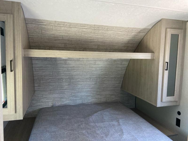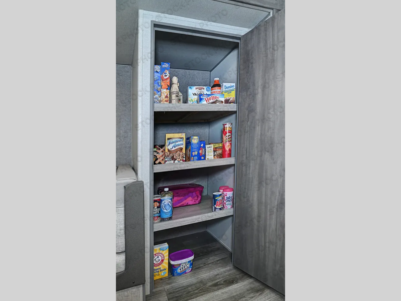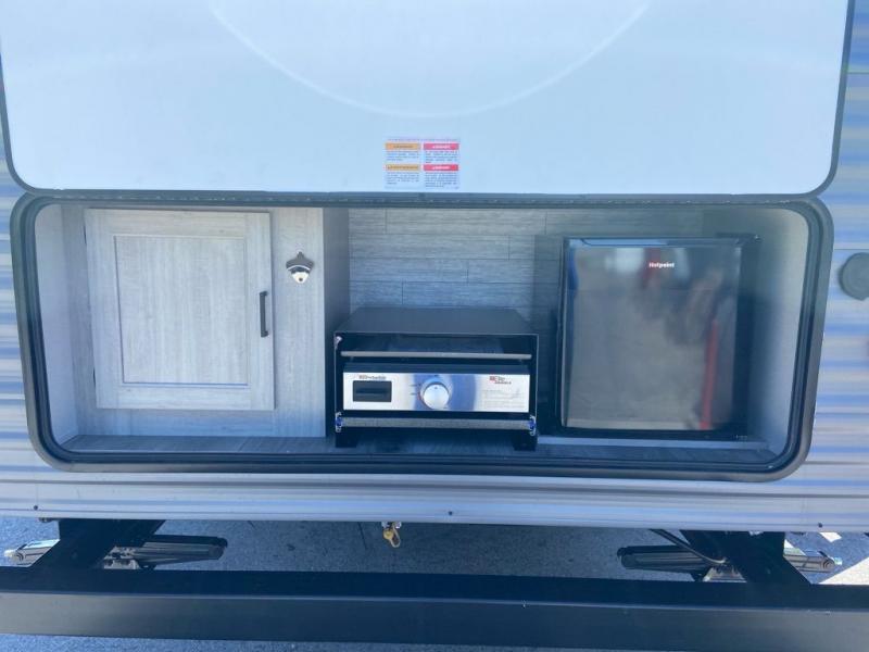 This bunkhouse travel trailer will be perfect for your whole crew! There is a large slide out in the main living area so you can stretch out, and here you'll find the U-shaped dinette and spacious pantry for snacks! The double-size bunks include steps leading up to them plus a wardrobe nearby for your guests' clothes. This model includes a walk-through bath with a tub/shower that will make bath time for little ones easier than ever, and you'll love having your own bedroom up front. A queen bed comes standard, along with dual wardrobes, plus one of the dual entry doors for convenience. The interior kitchen includes a three burner cooktop and a microwave oven, and the outdoor camper kitchen includes a pull-out griddle, a refrigerator, and a cabinet for storage!