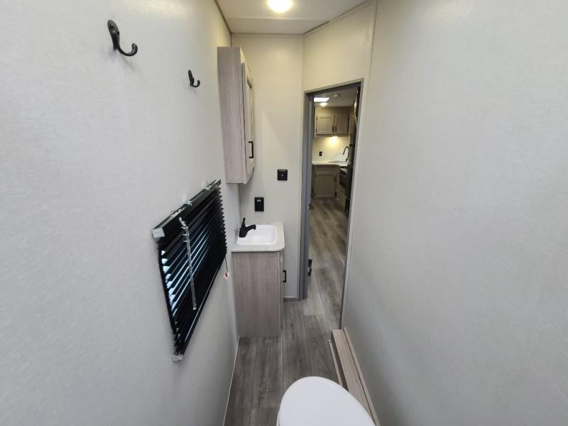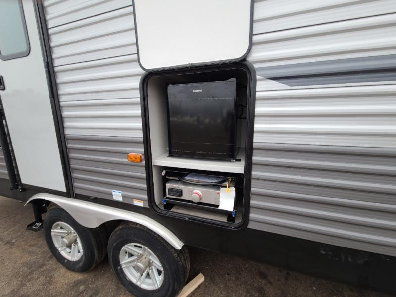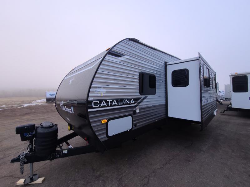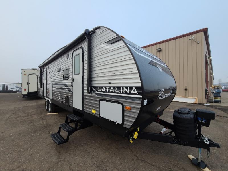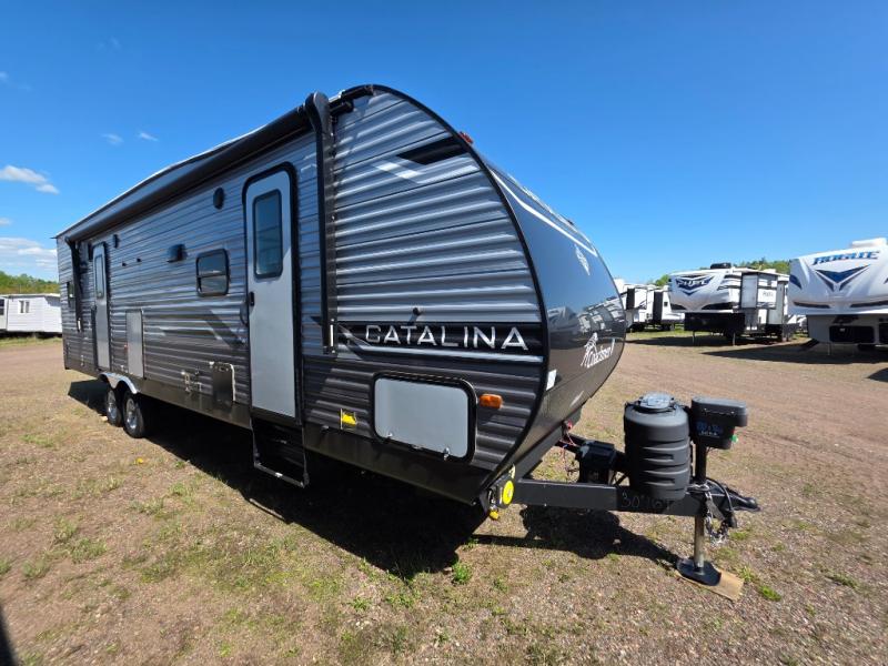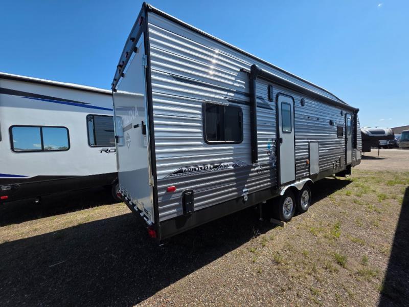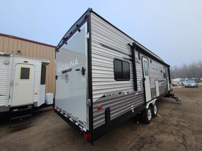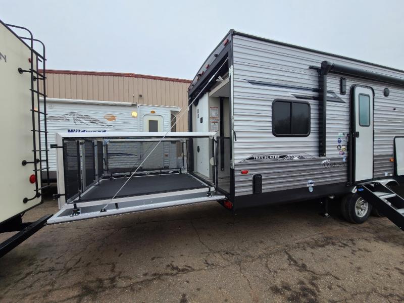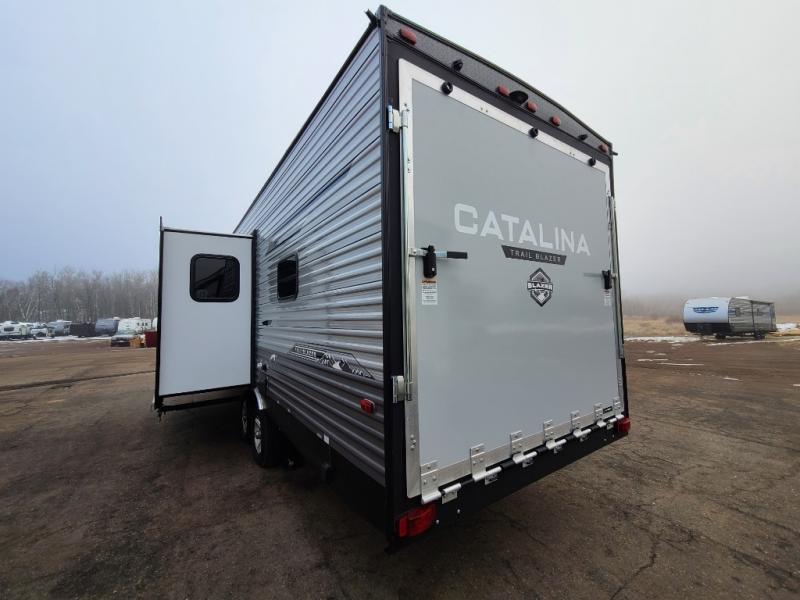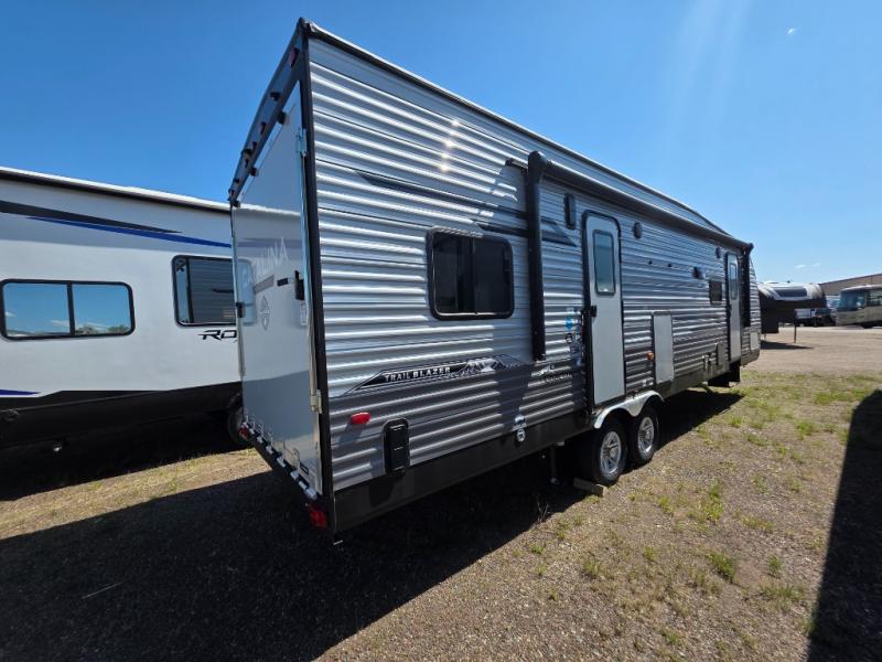The best looking, most affordable toy hauler is found in the Catalina Trailer Blazer by Coachmen. Each one is constructed with a seamless alpha roof membrane, an enclosed and fully sealed underbelly, and a cambered structural steel I-beam frame for added support. There is a rear loading cargo door with a 3,000 lb. capacity, a black out screen wall with a zip walk-thru and windows, plus 500 lb. tie-downs to secure your toys. You'll love the interior with its Congoleum woodplank linoleum flooring, pleated night shades, and LED interior lighting. Head outside to find an electric awning with multicolored LED lights and a remote, a 15' Toy Loc cable, a "Leash Link" quick hookup D-ring for pets, and upgraded aluminum wheels. The Catalina Trail Blazer also comes with RV-LINK 4G LTE connectivity with a WiFi booster and extender, a JBL Aura Cube media center, plus premium JBL interior speakers for your pleasure!