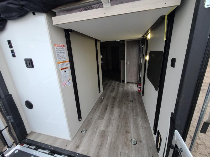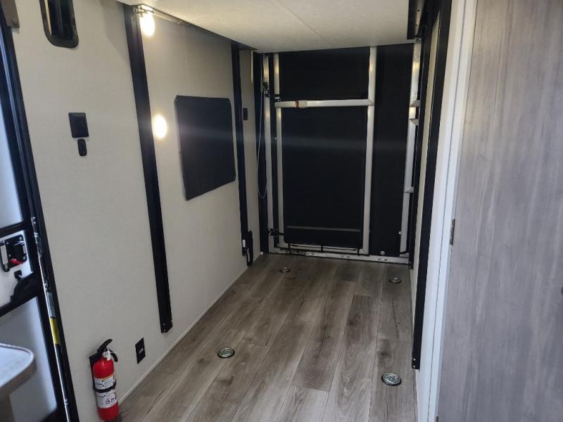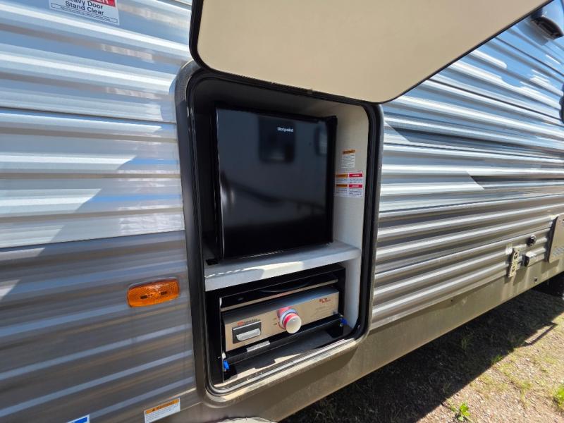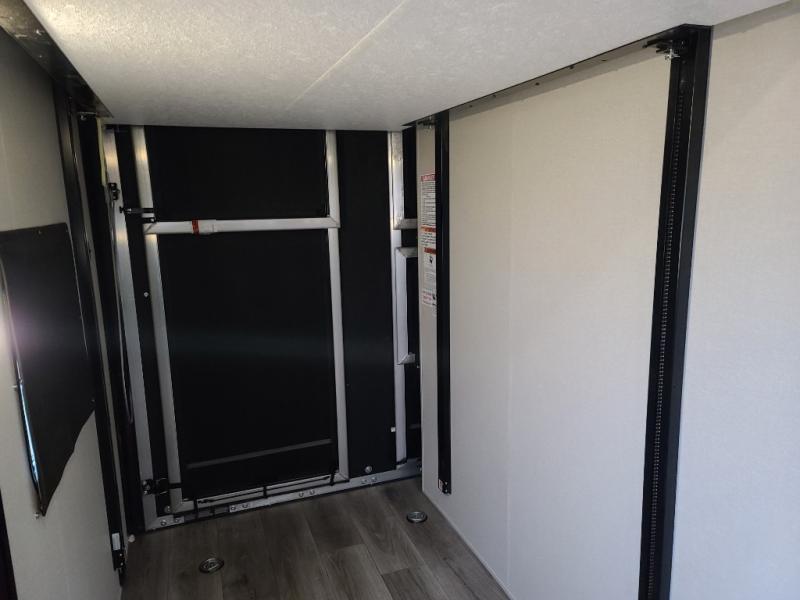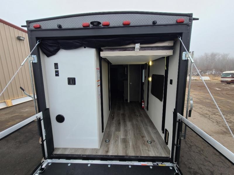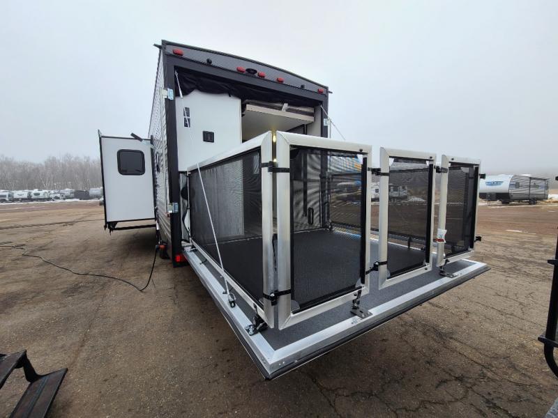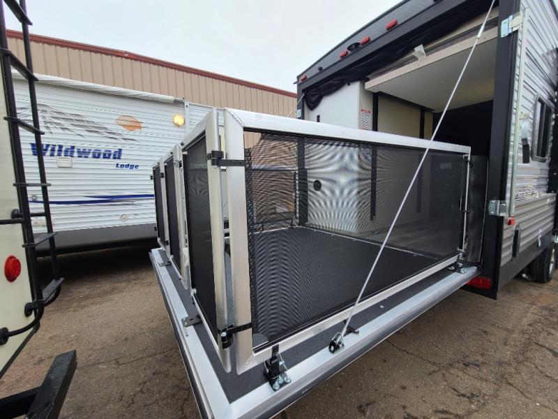 This toy hauler has lots of room for toys and guests! You will love the retreat of the front private queen bedroom with dual wardrobes and its own entry door. Additional guests can sleep in the double-size bunks with an electric trac bed lift in the cargo area, also with its own entry door. A rear corner bath makes efficient use of space and includes a 24" x 32" shower and a medicine cabinet. The main living area features an entertainment center that can be upgraded with an optional fireplace for maximum coziness. Relax on the sofa or the U-shaped dinette. You'll also appreciate the kitchen with its L-shaped counter, corner sink, microwave, GE stainless 10.7 cu. ft. 12V refrigerator, and three-burner range. Or step outside and use the camper kitchen with a griddle and mini refrigerator!