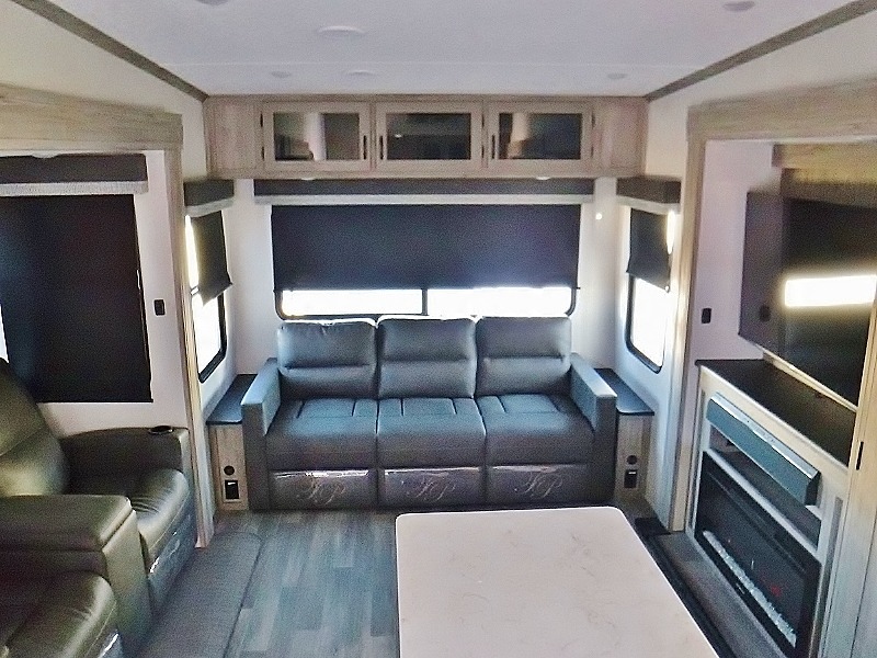 Each Chaparral mid-profile fifth wheel by Coachmen is designed with residential features, loads of storage space, and roomy bedroom suites to make you feel right at home. The durable construction means you can enjoy your RV for years to come. There's 6X double Azdel aluminum cage sidewall system, Weather Shield+ technology, and Tri-Tex powder coated frame technology that will allow you to camp year around. Each model includes a Winegard Air 360 HDTV/radio dome antenna and an AM/FM stereo with Bluetooth and USB ports to keep you entertained, plus roller night shades and a modern electric fireplace to make your space cozy. There is also a large transom window in the kitchen, a modern high-rise faucet, LED motion sensor lights in the bathroom, plus a full-size shower with glass doors and a seat. Now that's what I call luxury! Choose a Chaparral fifth wheel today!
