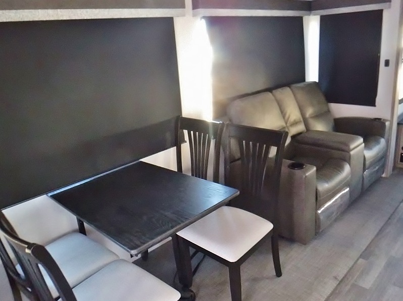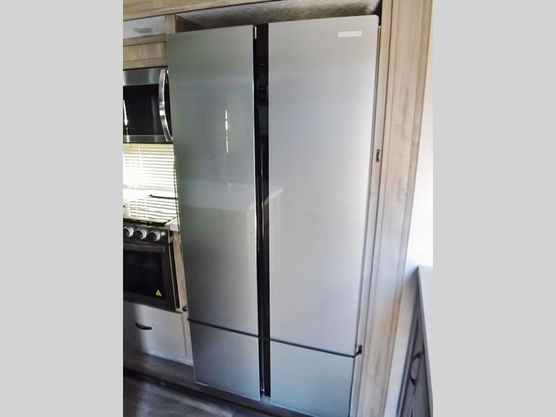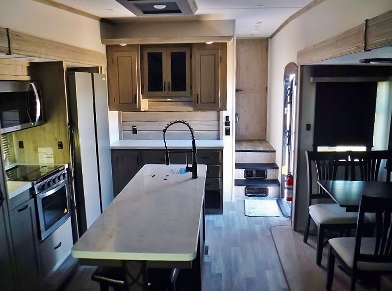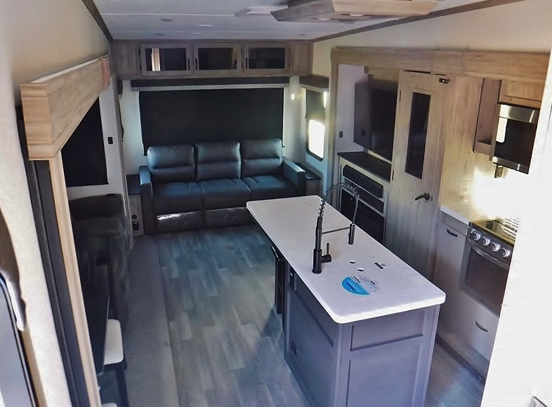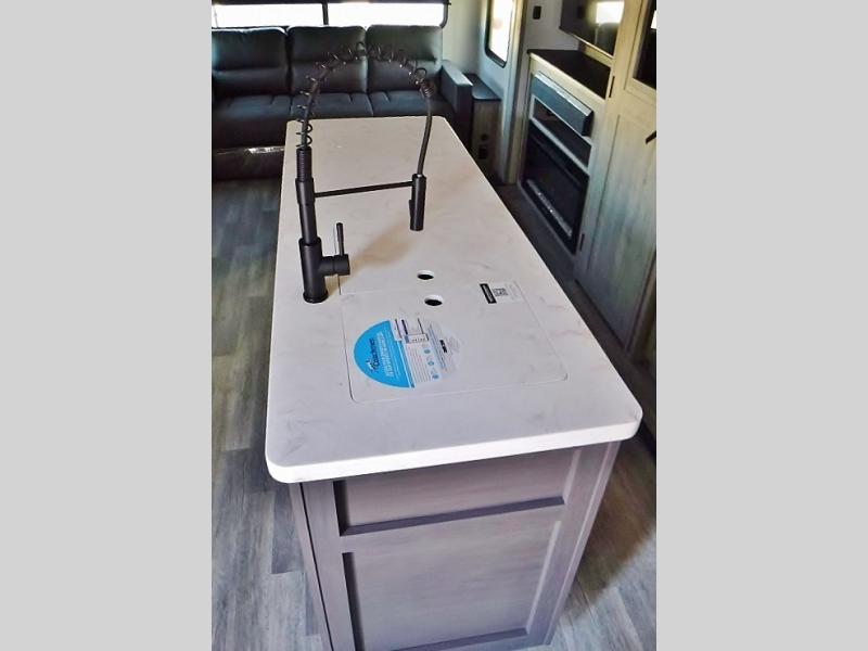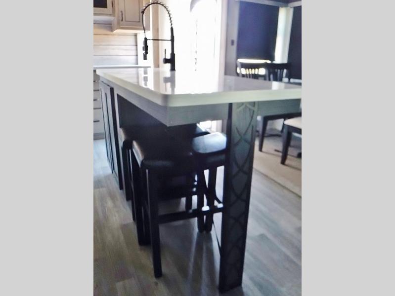 Are you wanting to trade out your busy work weeks for relaxing vacations? This fifth wheel can give you just that! Once you arrive at your destination, set up the 16' power awning with LED lights and enjoy some fresh air before you unpack your bags. The chef can start lunch on the three burner residential cooktop, and there is an island with two barstools if the little ones want to color while they wait on their food. This model also includes a large pantry plus extra counter space with overhead storage for dishes. Everyone can take turns cleaning up in the full bath that includes a spacious shower with a seat and a linen closet to keep clean towels close by. When it's time to call it a night, you'll enjoy the king bed slide out in the front bedroom, while your guests take the rear tri-fold hide-a-bed sofa!