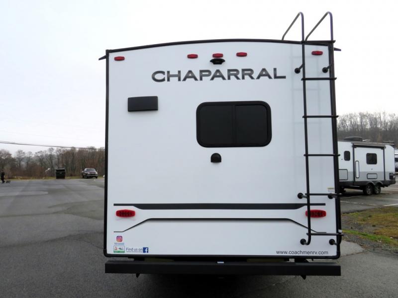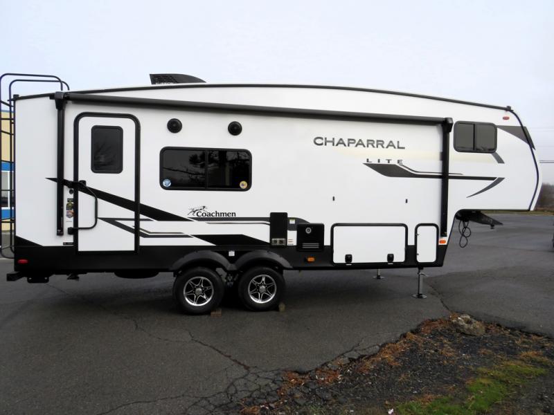 Comfort, convenience, and an easy haul is what you will find with each one of these Coachmen RV Chaparral Lite fifth wheels! Their Tri-Tex powder coated frame technology is up to 5X more weather resistant, and the dual-sided Azdel composite sidewall panels is ultra durable. The Road Armor suspension by Trail Air comes with heavy duty shackles and wet bolts so you can be sure it will hold up through every adventure, and you might want to add the exterior back-up and sideview camera prep for easy parking. You will feel right at home inside with a modern sound bar with a stereo, blackout roller night shades, Thomas Payne furniture, and many more comforts! The exterior is just as inviting with its electric awning with LED lights, Solid Step entry steps, and pass-through storage for all your gear!