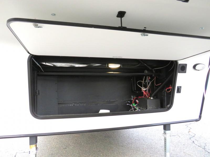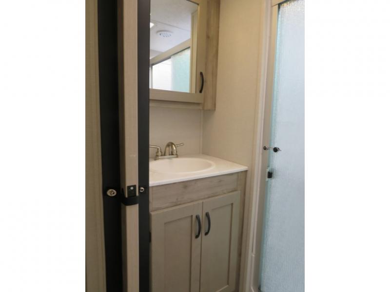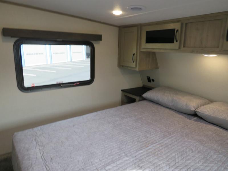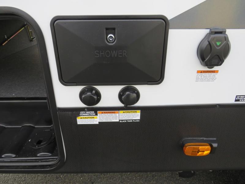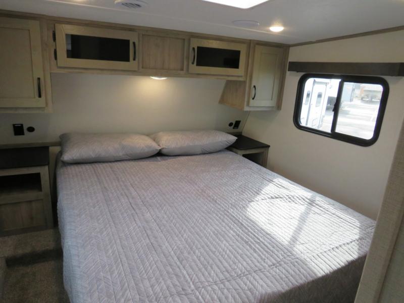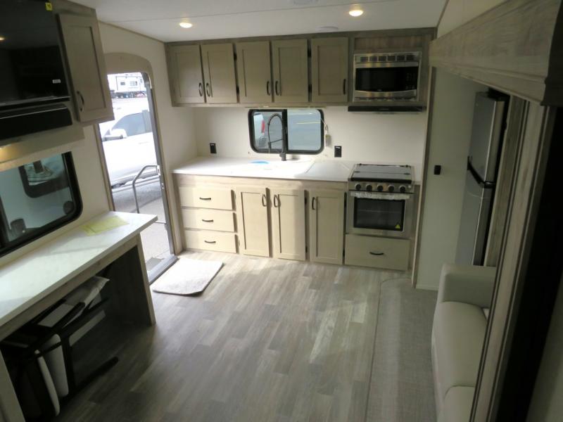 You'll love the space you have in this rear kitchen travel trailer thanks to the slide out in the main living area/kitchen. You can relax on the hide-a-bed sofa or on the two lounge chairs or head outdoors to sit under the power awning with LED lights. The full bathroom includes a large shower with sliding glass doors for some added luxury, and the front private bedroom is close by for convenience. Here, you'll find a queen bed with dual nightstands for your things and a wardrobe to keep your clothes wrinkle-free. After you've worked up an appetite after hiking, head to the rear kitchen to prepare lunch on the residential cooktop, and leftovers can go in the 10.7 cu. ft. 12V refrigerator!