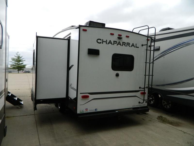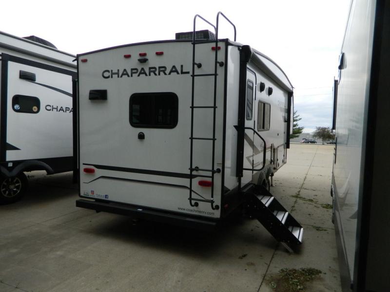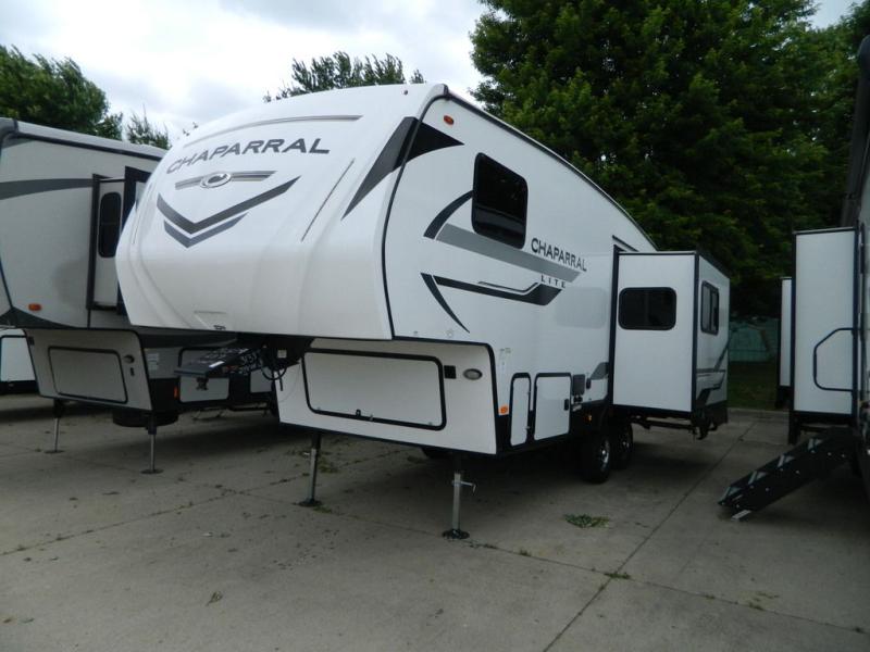 Comfort, convenience, and an easy haul is what you will find with each one of these Coachmen RV Chaparral Lite fifth wheels! Their Tri-Tex powder coated frame technology is up to 5X more weather resistant, and the dual-sided Azdel composite sidewall panels is ultra durable. The Road Armor suspension by Trail Air comes with heavy duty shackles and wet bolts so you can be sure it will hold up through every adventure, and you might want to add the exterior back-up and sideview camera prep for easy parking. You will feel right at home inside with a modern sound bar with a stereo, blackout roller night shades, Thomas Payne furniture, and many more comforts! The exterior is just as inviting with its electric awning with LED lights, Solid Step entry steps, and pass-through storage for all your gear!