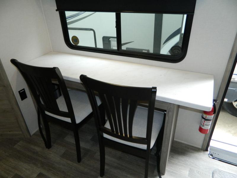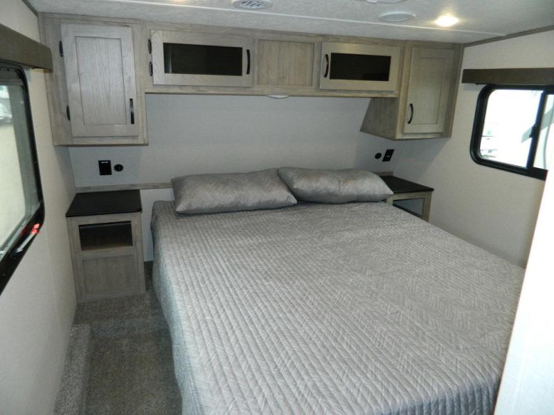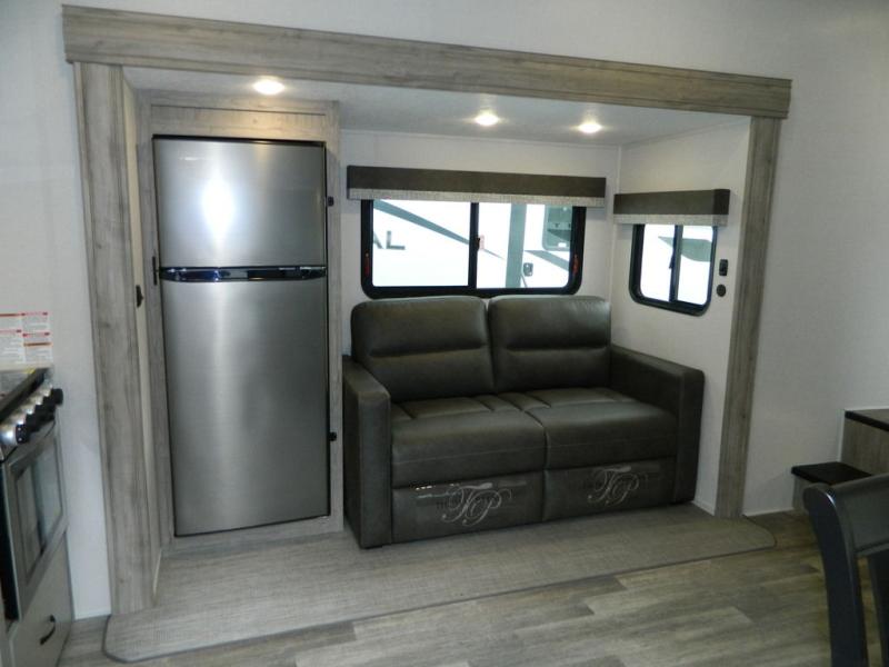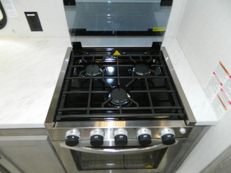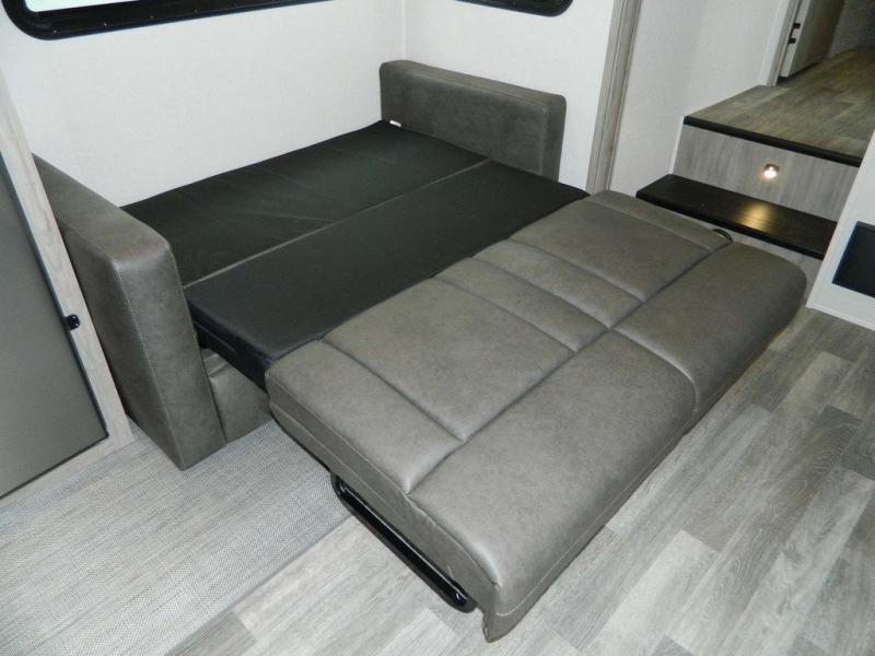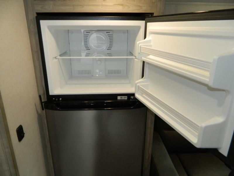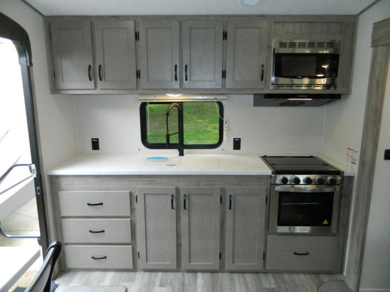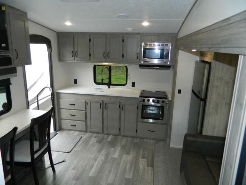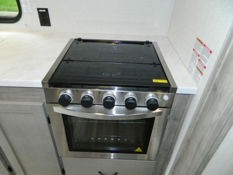 You'll love the space you have in this rear kitchen travel trailer thanks to the slide out in the main living area/kitchen. You can relax on the hide-a-bed sofa or on the two lounge chairs, or head outdoors to sit under the power awning with LED lights. The full bathroom includes a large shower with sliding glass doors for some added luxury, and the front private bedroom is close by for convenience. Here, you'll find a queen bed with dual nightstands for your things and a wardrobe to keep your clothes wrinkle-free. After you've worked up an appetite after hiking, head to the rear kitchen to prepare lunch on the residential cooktop, and leftovers can go in the 10.7 cu. ft. 12V refrigerator!