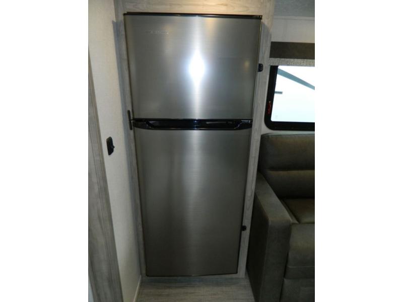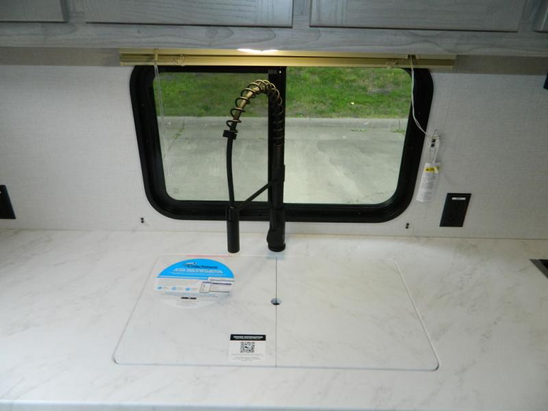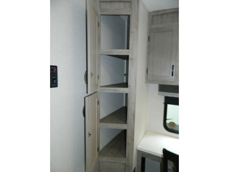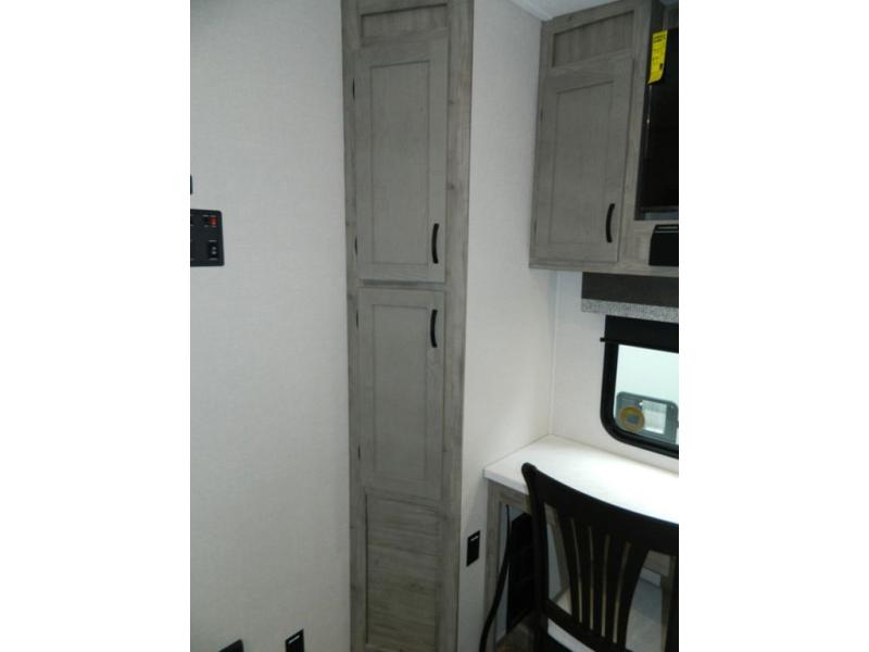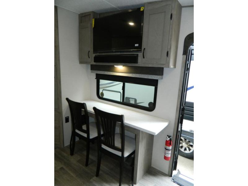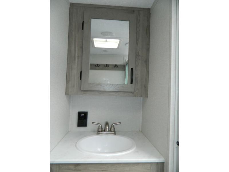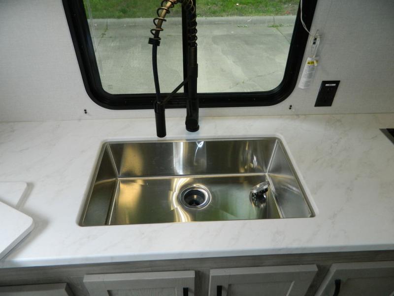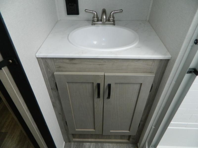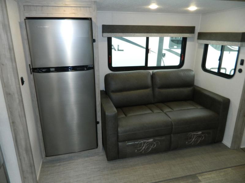 You'll love the space you have in this rear kitchen travel trailer thanks to the slide out in the main living area/kitchen. You can relax on the hide-a-bed sofa or on the two lounge chairs, or head outdoors to sit under the power awning with LED lights. The full bathroom includes a large shower with sliding glass doors for some added luxury, and the front private bedroom is close by for convenience. Here, you'll find a queen bed with dual nightstands for your things and a wardrobe to keep your clothes wrinkle-free. After you've worked up an appetite after hiking, head to the rear kitchen to prepare lunch on the residential cooktop, and leftovers can go in the 10.7 cu. ft. 12V refrigerator!