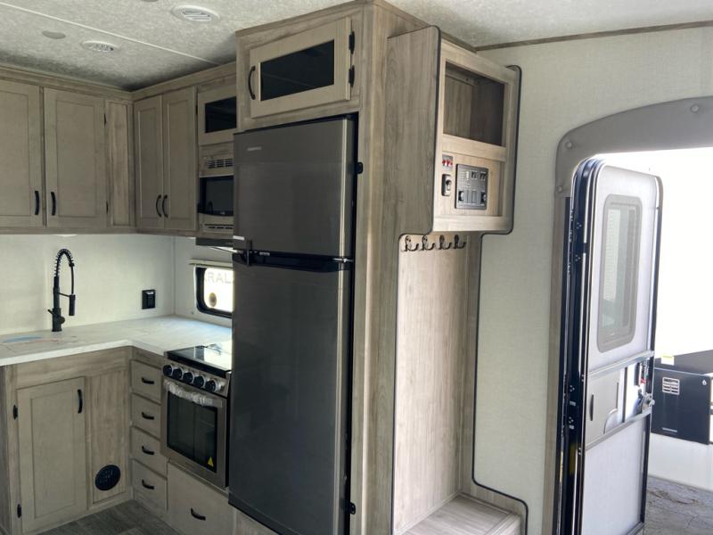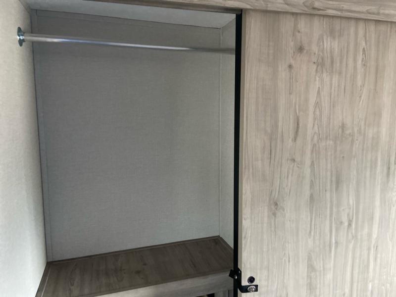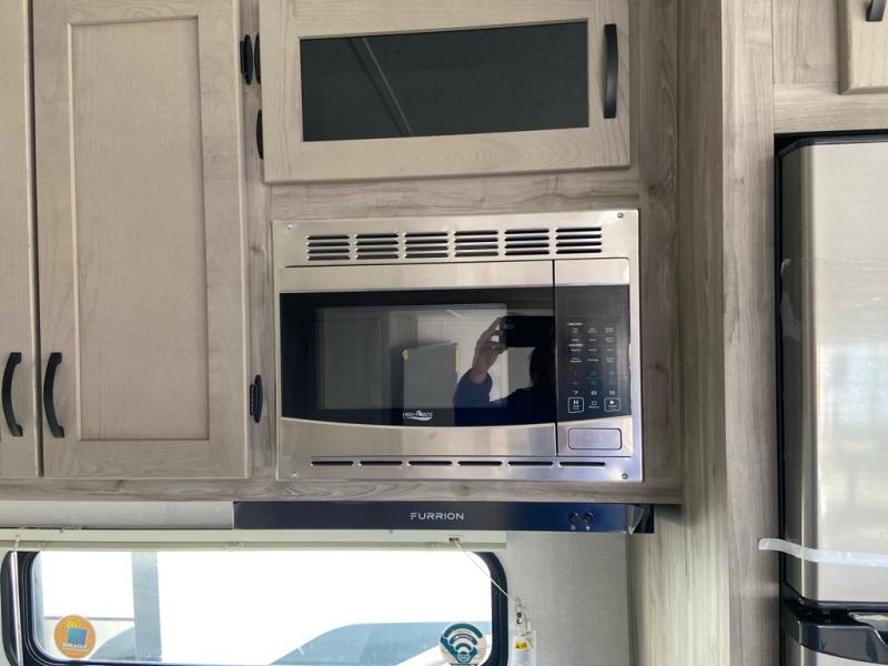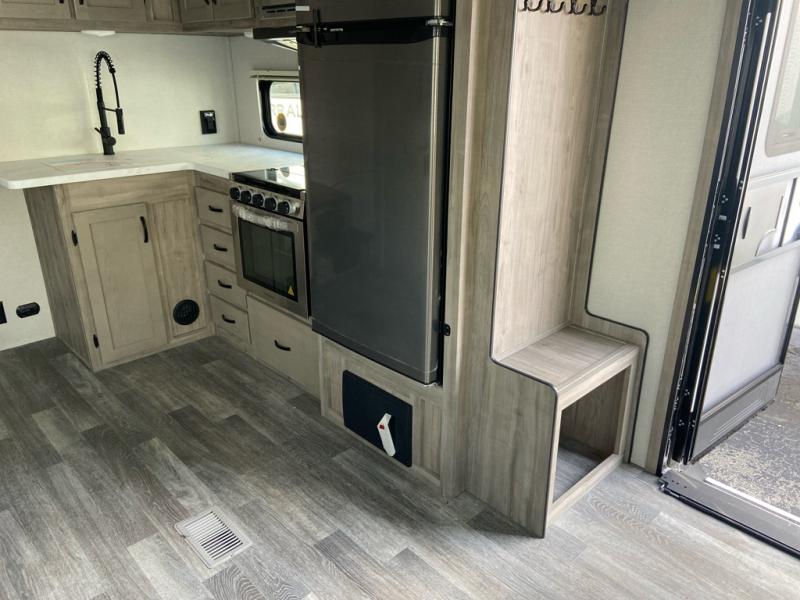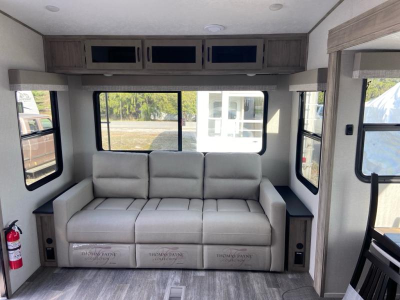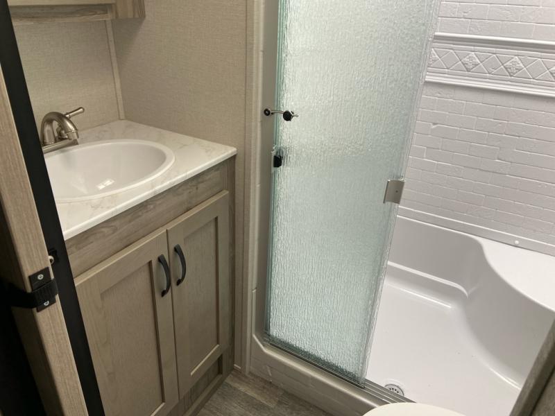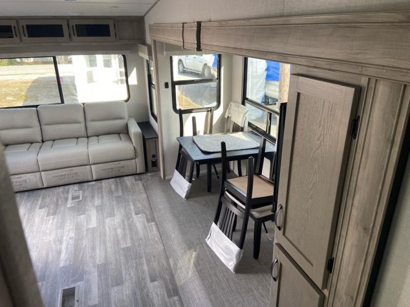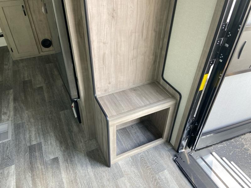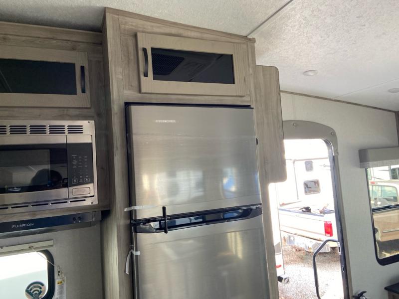 You and your spouse will have a comfortable getaway in this fifth wheel! The rear living area is the perfect place to wind down your nights by relaxing on either the 78" tri-fold hide-a-bed sofa or play a few card games at the free-standing table while enjoying snacks that were stored in the pantry next to the entertainment center. The fully equipped kitchen has everything you need to prepare delicious home cooked meals. The full bathroom has a 40" x 30" shower with a seat to freshen up in each morning after getting a good night's rest on the queen bed in the front private bedroom, plus there is a wardrobe in the bedroom to keep your clothes looking their best!
