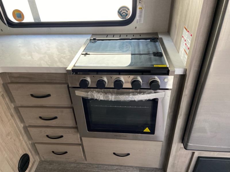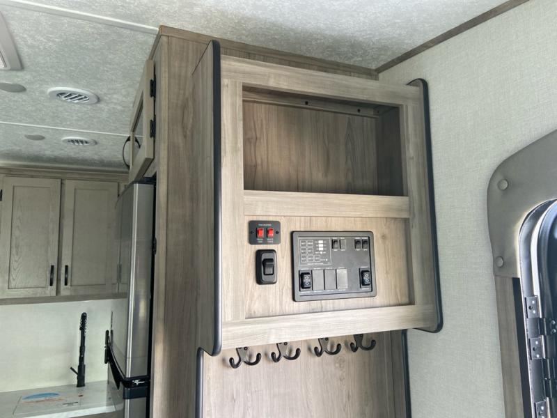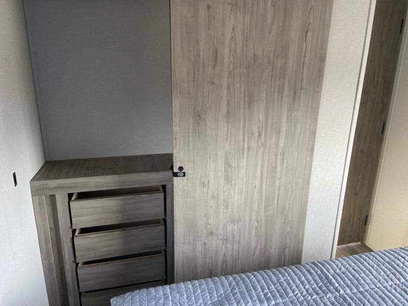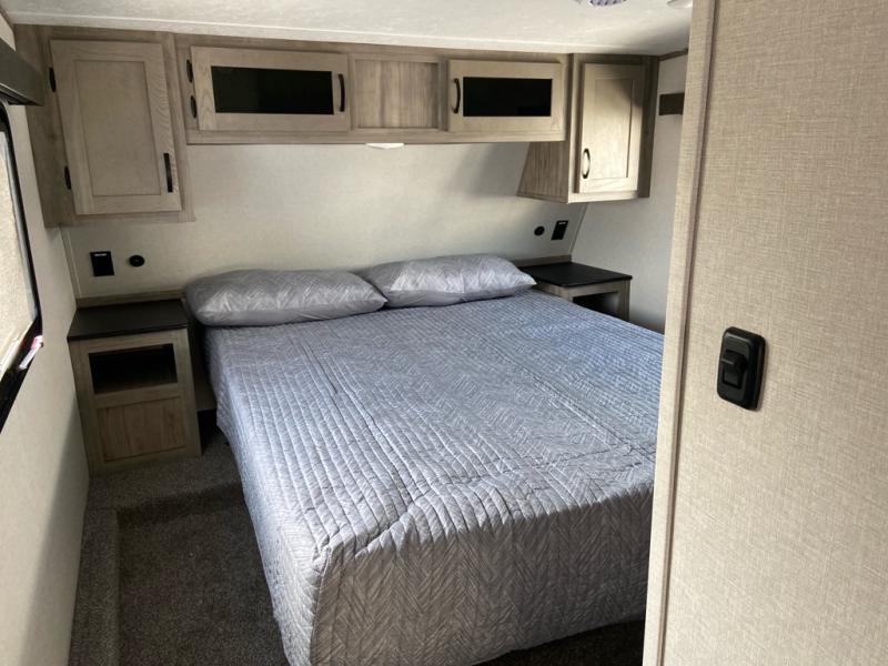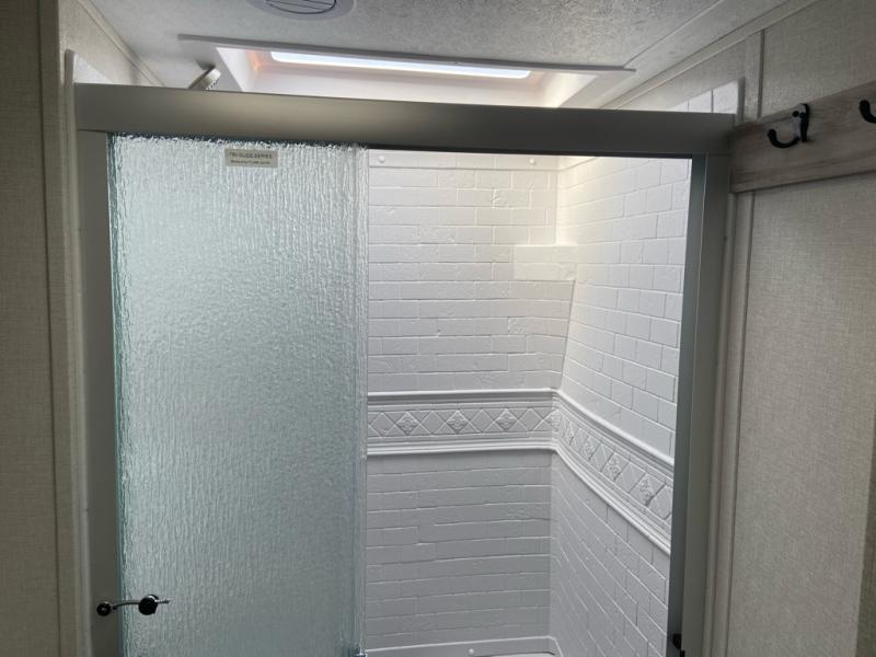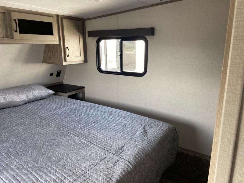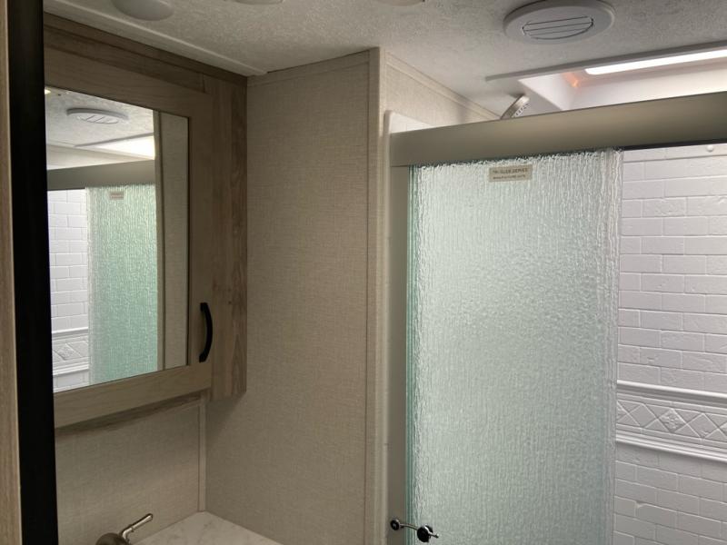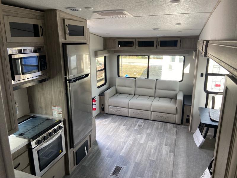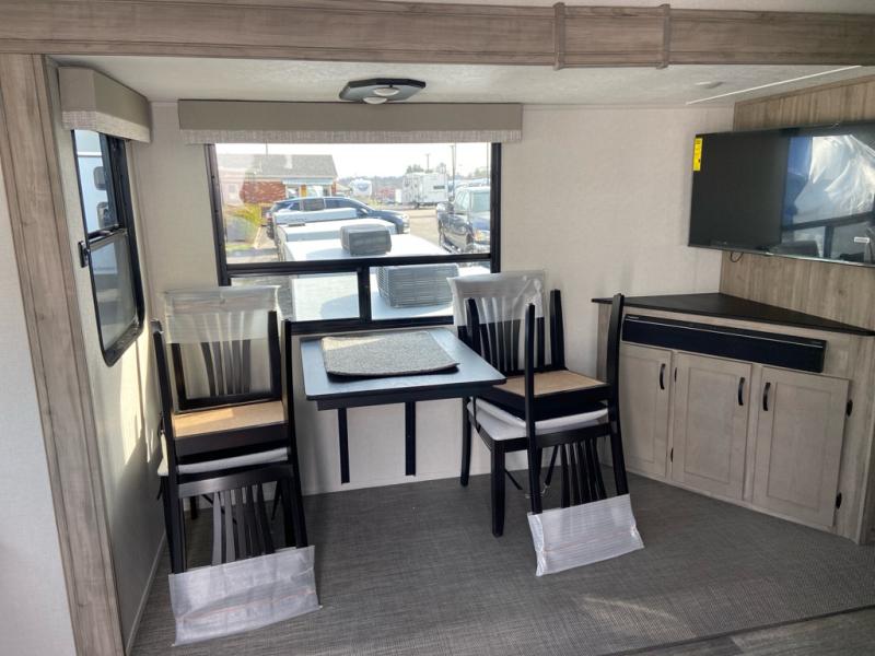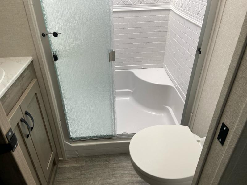 You and your spouse will have a comfortable getaway in this fifth wheel! The rear living area is the perfect place to wind down your nights by relaxing on either the 78" tri-fold hide-a-bed sofa or play a few card games at the free-standing table while enjoying snacks that were stored in the pantry next to the entertainment center. The fully equipped kitchen has everything you need to prepare delicious home cooked meals. The full bathroom has a 40" x 30" shower with a seat to freshen up in each morning after getting a good night's rest on the queen bed in the front private bedroom, plus there is a wardrobe in the bedroom to keep your clothes looking their best!