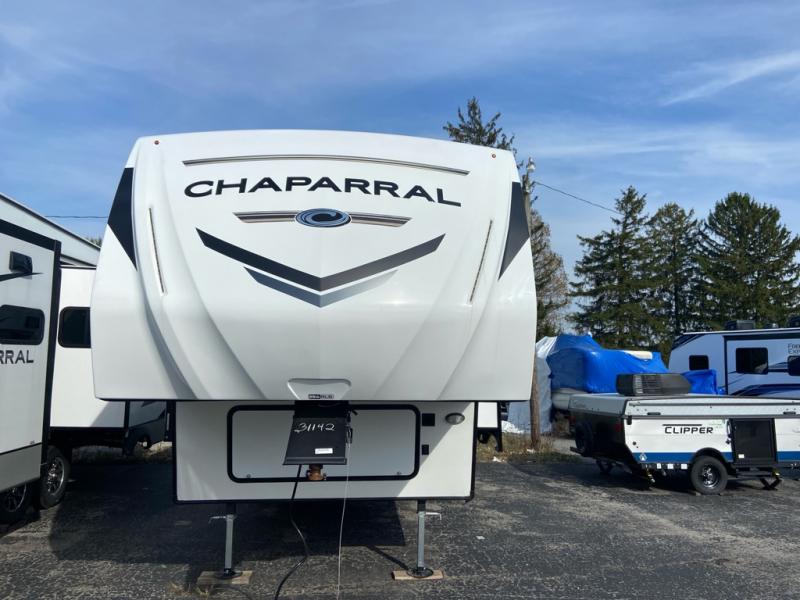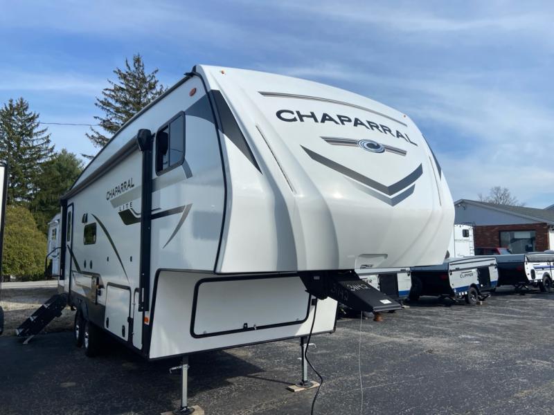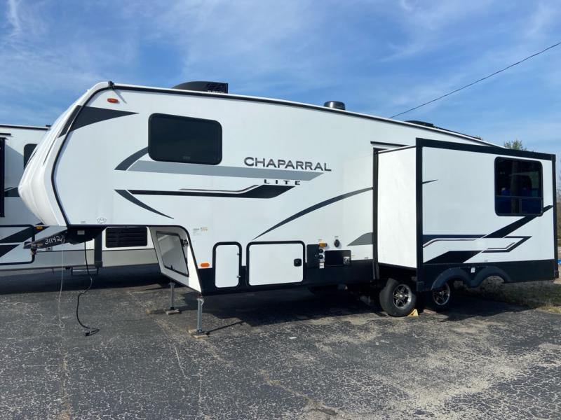 Comfort, convenience, and an easy haul is what you will find with each one of these Coachmen RV Chaparral Lite fifth wheels! Their Tri-Tex powder coated frame technology is up to 5X more weather resistant, and the dual-sided Azdel composite sidewall panels is ultra durable. The Road Armor suspension by Trail Air comes with heavy duty shackles and wet bolts so you can be sure it will hold up through every adventure, and you might want to add the exterior back-up and sideview camera prep for easy parking. You will feel right at home inside with a modern sound bar with a stereo, blackout roller night shades, Thomas Payne furniture, a high BTU output modern electric fireplace, and many more comforts! The exterior is just as inviting with its electric awning with LED lights, Solid Step entry steps, and pass-through storage for all your gear!