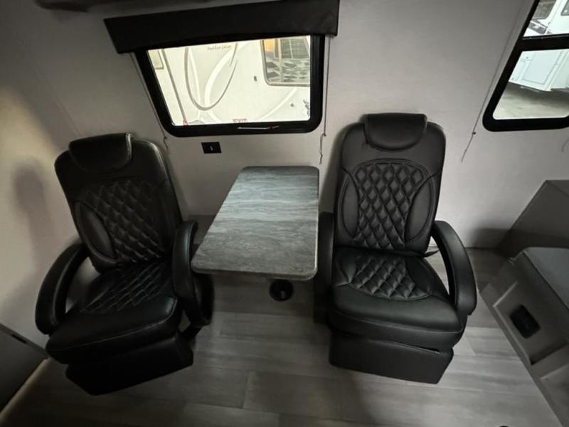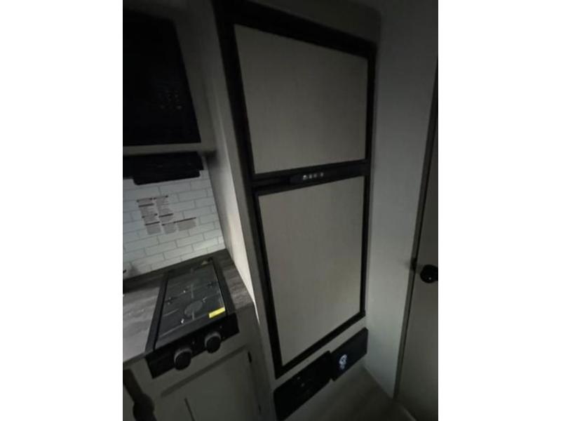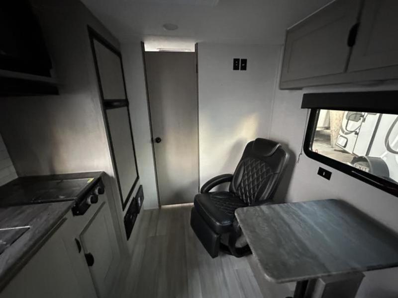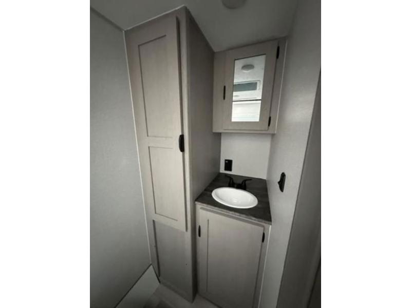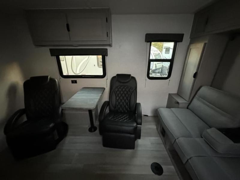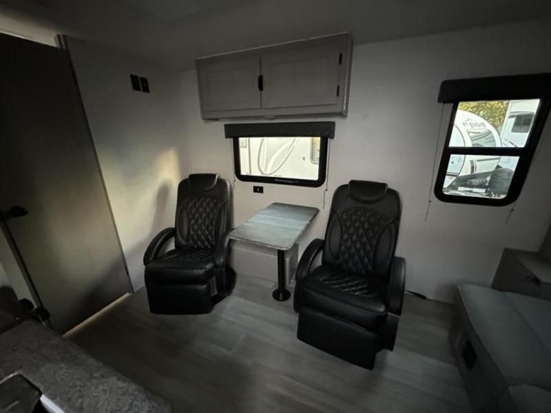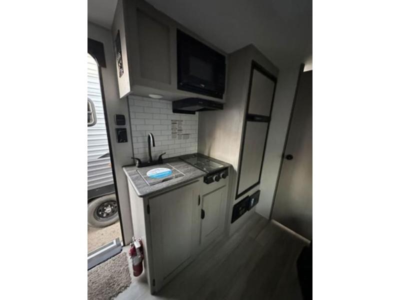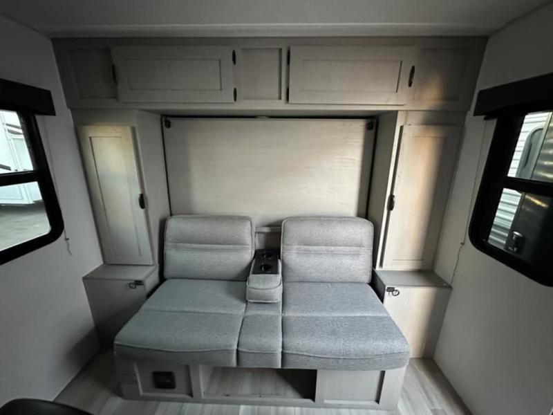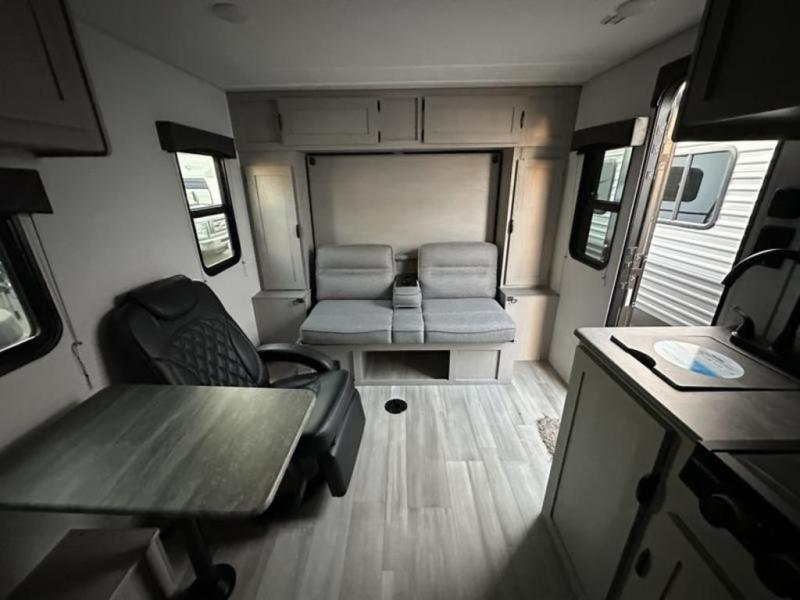 Take this versatile couple's travel trailer to your favorite destinations! It features a front jackknife sofa "Murphy Bed" for you to have ample seating during the day and at night a comfy bed. There are also two wardrobes with a private shelf on each end and an overhead shelf above for your things. There is additional seating with two recliner chairs including a table between opposite the kitchen area. This space also features overhead storage. The full rear bath offers a 24" x 36" shower, sink with medicine cabinet and linen storage as well. You can easily cook simple camp meals using the two burner cooktop or the microwave. On the exterior, a front pass-through storage compartment is available for all of your outdoor gear!