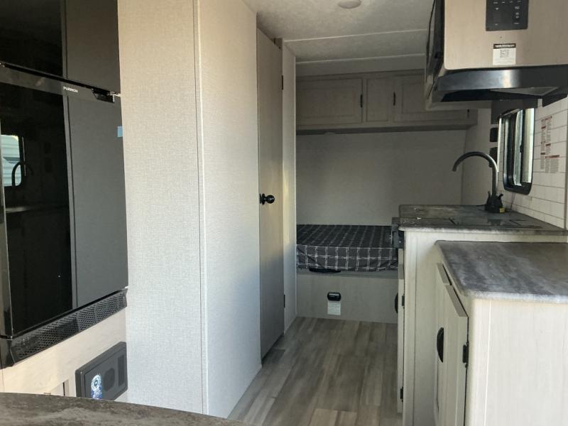 This travel trailer is the perfect cozy trailer for two with a removable and open L-shaped seating in back as you enter. A countertop/desk with storage is also located near the entry door, or you could choose an optional fireplace in it's place. Up front, a mattress for sleeping with a large overhead cabinet and shelf for your things. The kitchen features a two burner cooktop, overhead microwave oven and single sink. The refrigerator is located on the opposite side near the L-seating. You will appreciate having a full bath including a 24" x 36" shower, vanity with sink and linen storage, plus foot flush toilet and skylight for more headroom and natural light. So, no late night running in the dark to a campground bathroom. On the outside, plenty of storage in the large pass-thru compartment and a 10' awning to create even more living space to enjoy!