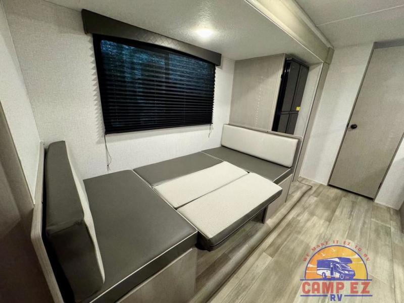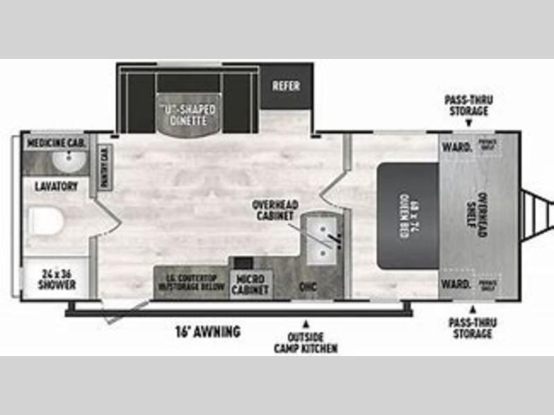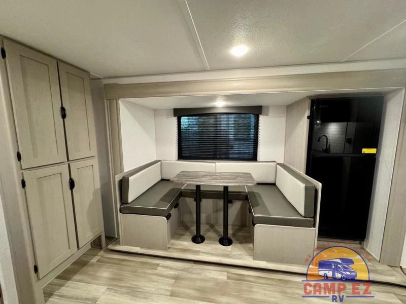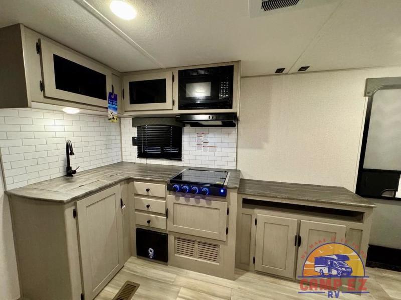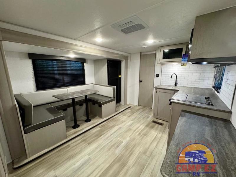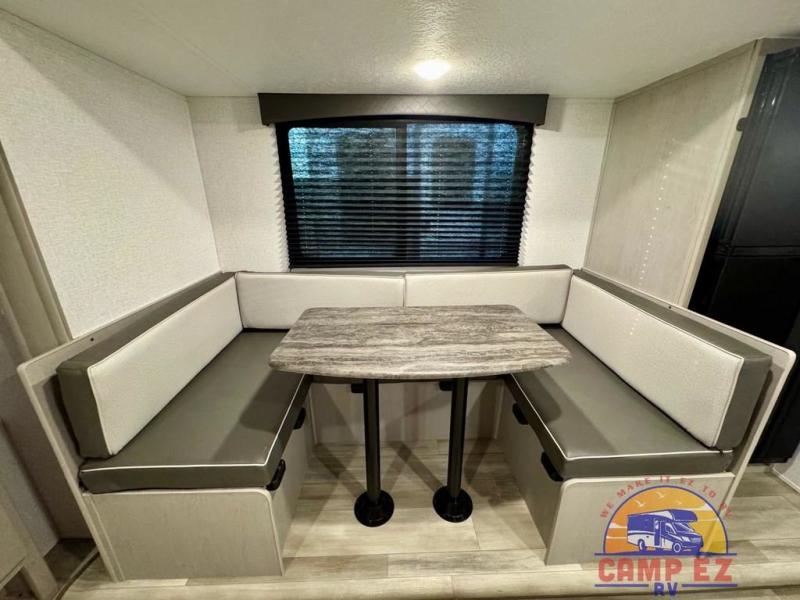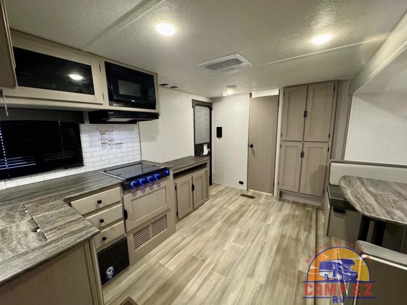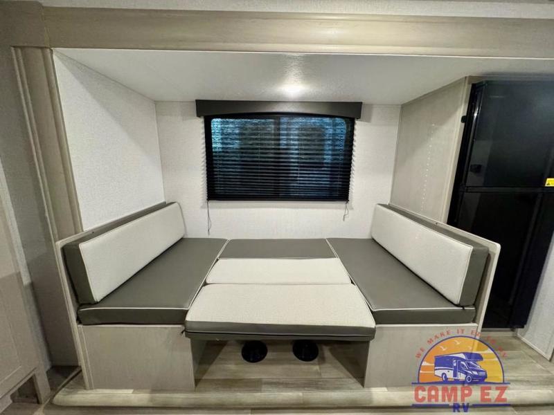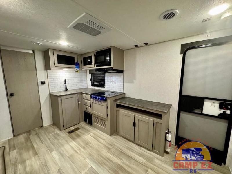 You will feel right at home in this travel trailer! The front private bedroom has a 60" x 74" RV queen bed with wardrobes and private shelves on either side of it. Prepare your best home cooked meals in the kitchen with the two burner cooktop, microwave, 11 cu. ft. 12-volt refrigerator, and large countertop with storage below it. An optional outside kitchen with griddle and bracket can also be added. Enjoy all of your meals and games at the U-shaped dinette, and you can even convert it into an extra sleeping space if needed. The full rear bathroom has a 24" x 36" shower to freshen up in each morning, and a medicine cabinet to keep your toiletries out of the way!