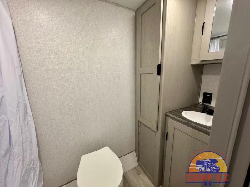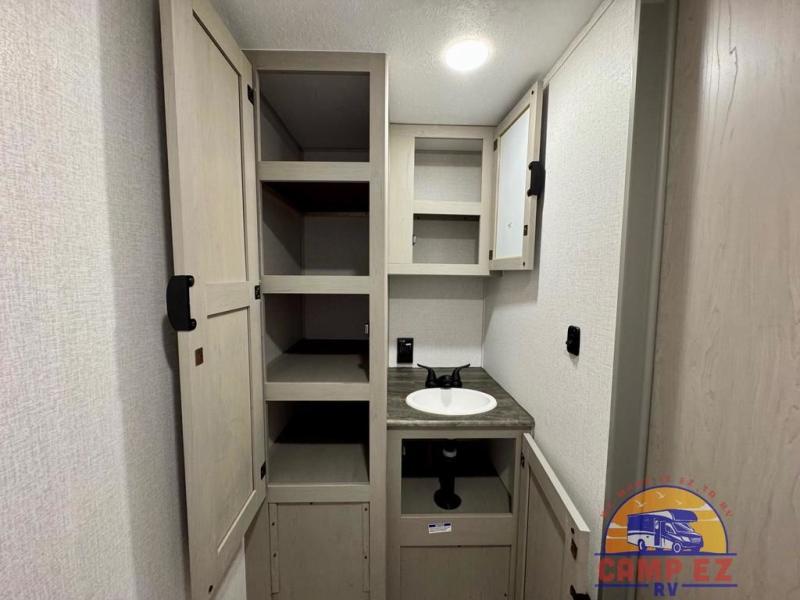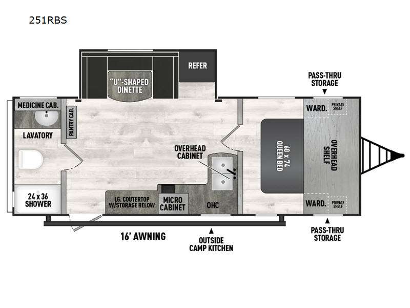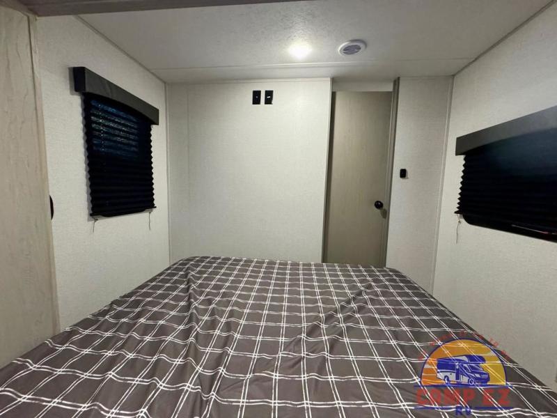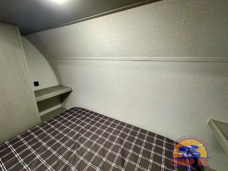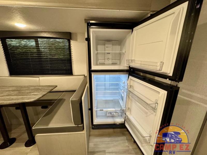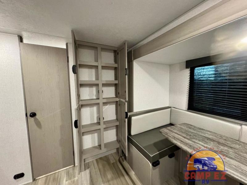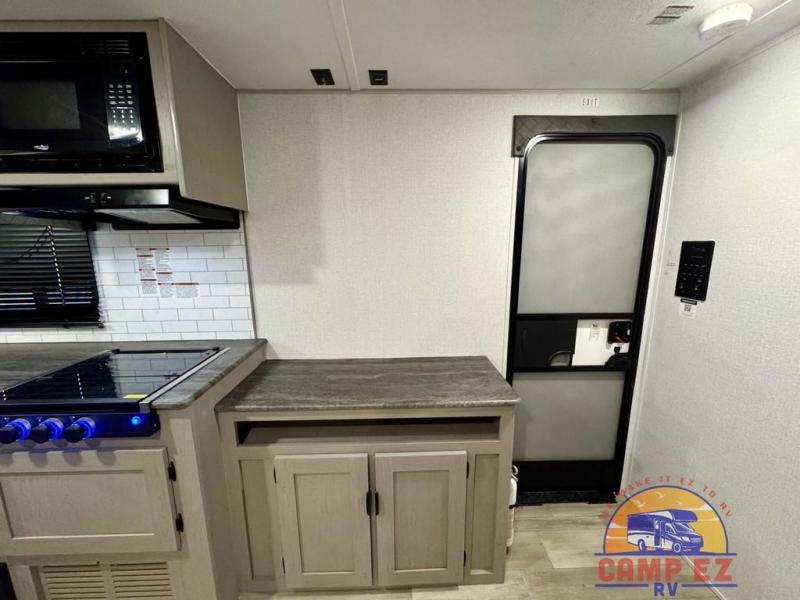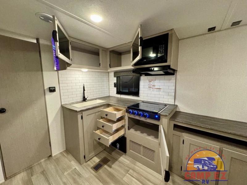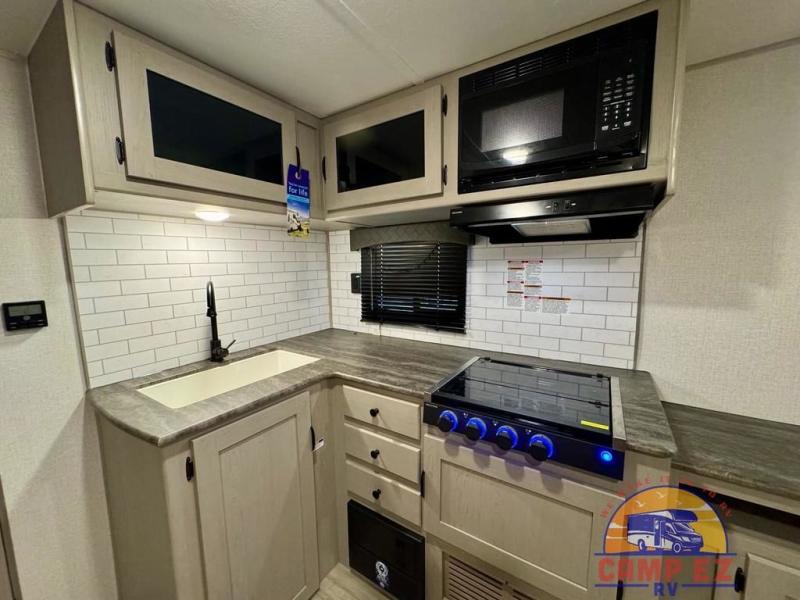 You will feel right at home in this travel trailer! The front private bedroom has a 60" x 74" RV queen bed with wardrobes and private shelves on either side of it. Prepare your best home cooked meals in the kitchen with the two burner cooktop, microwave, 11 cu. ft. 12-volt refrigerator, and large countertop with storage below it. An optional outside kitchen with griddle and bracket can also be added. Enjoy all of your meals and games at the U-shaped dinette, and you can even convert it into an extra sleeping space if needed. The full rear bathroom has a 24" x 36" shower to freshen up in each morning, and a medicine cabinet to keep your toiletries out of the way!