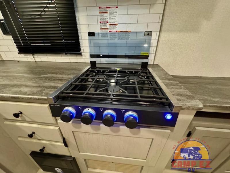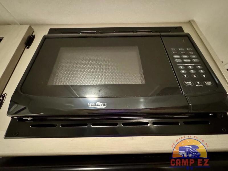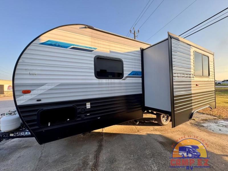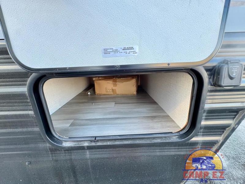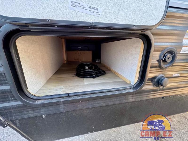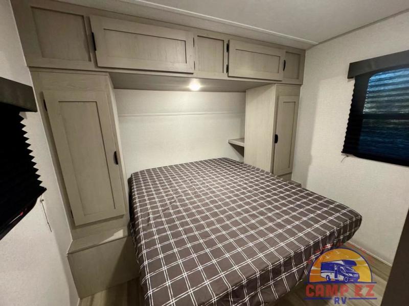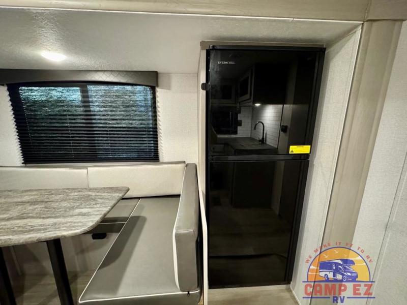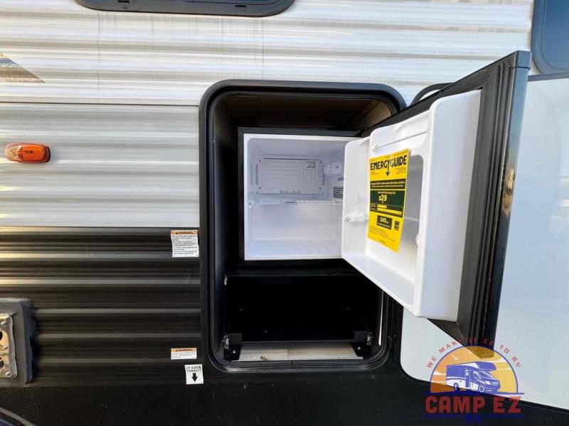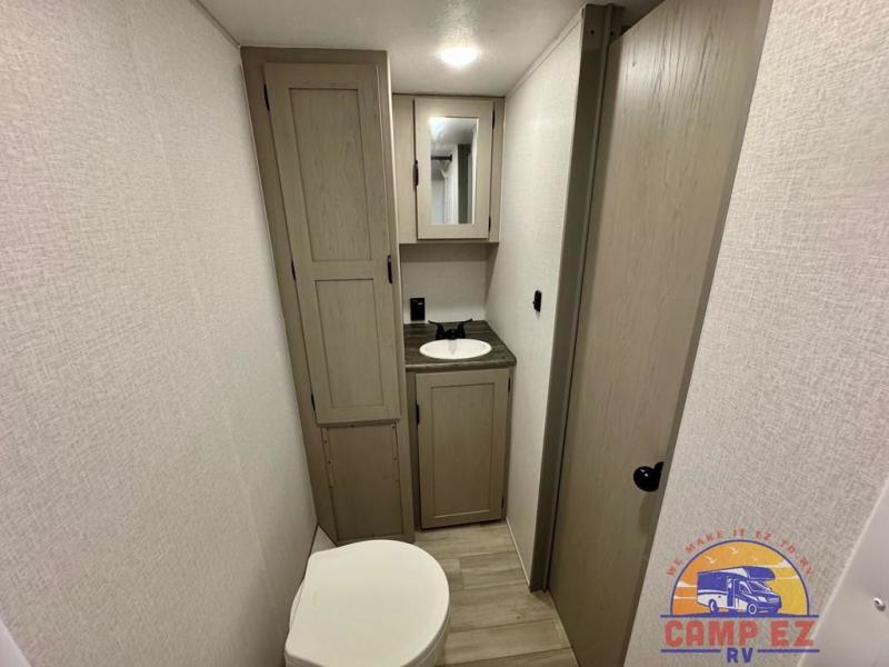 You will feel right at home in this travel trailer! The front private bedroom has a 60" x 74" RV queen bed with wardrobes and private shelves on either side of it. Prepare your best home cooked meals in the kitchen with the two burner cooktop, microwave, 11 cu. ft. 12-volt refrigerator, and large countertop with storage below it. An optional outside kitchen with griddle and bracket can also be added. Enjoy all of your meals and games at the U-shaped dinette, and you can even convert it into an extra sleeping space if needed. The full rear bathroom has a 24" x 36" shower to freshen up in each morning, and a medicine cabinet to keep your toiletries out of the way!