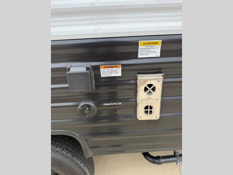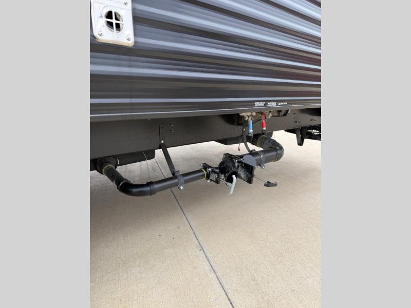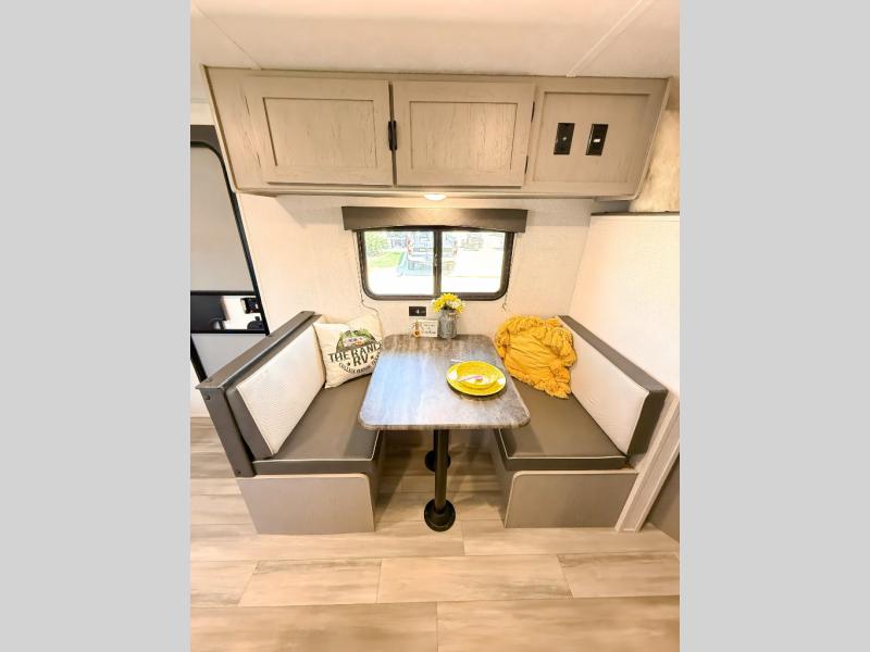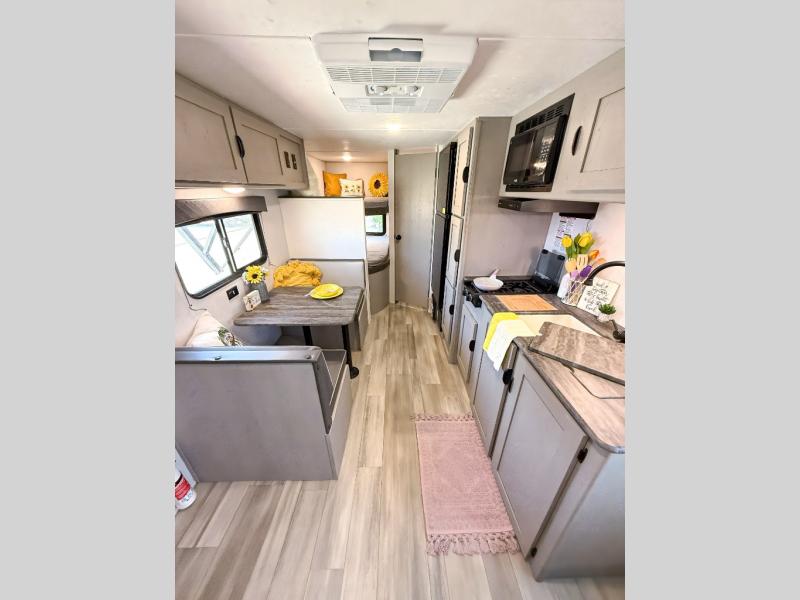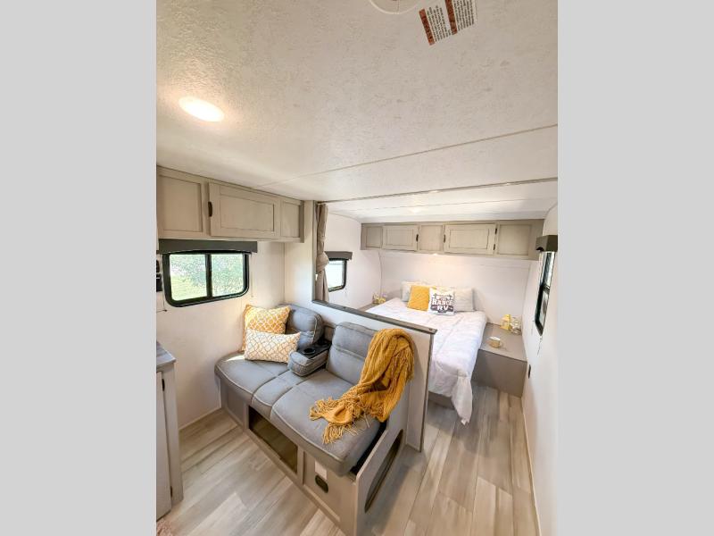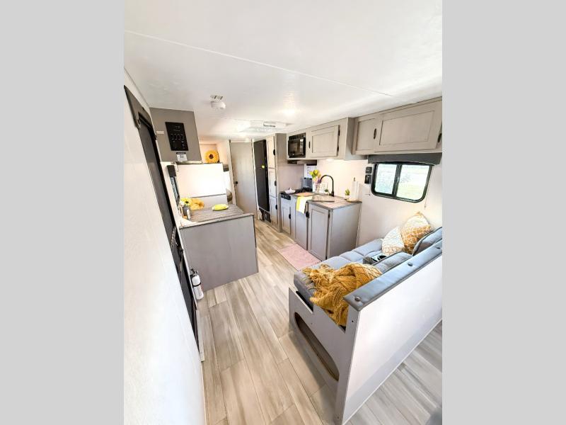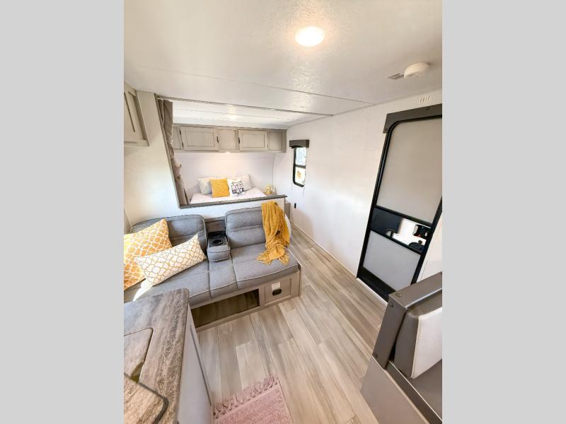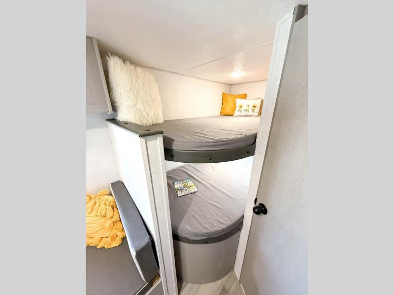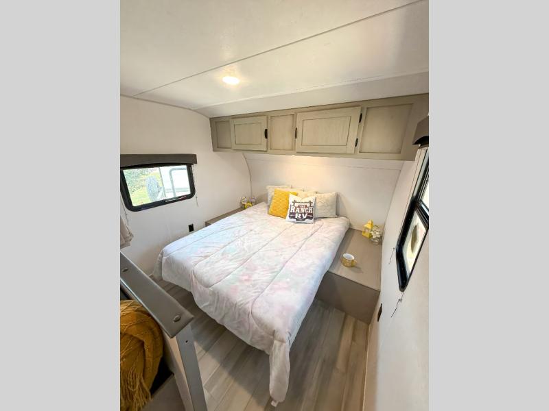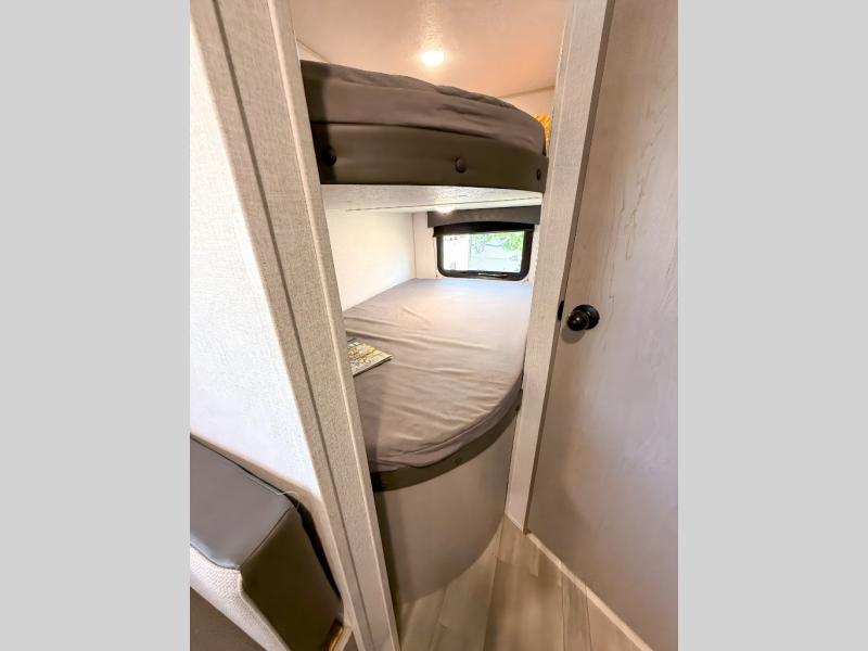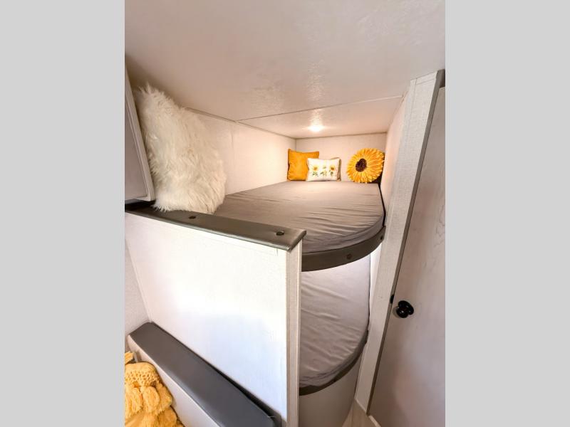 Bring the whole family with you in this travel trailer! The kiddos can sleep on the rear corner set of double bed bunks. The opposite rear corner features a full bath including a 24" x 36" shower, linen cabinet, toilet, and vanity with medicine cabinet overhead. In the main living space you will find plenty of seating with a booth dinette and jackknife sofa which can also transform into an extra sleeping space if needed. Everyone's bellies will stay full with the two burner cooktop, 11 cu. ft. 12-volt refrigerator, and microwave which you can use to pop a bag of popcorn for movie night. You will enjoy the front bedroom for a bit of privacy including a queen bed and large overhead cabinet for your things. On the outside, a large front pass-through for lawn chairs and camp gear. There is more storage beneath the double bed bunks in back and a nice 10' awning to provide protection from the elements when outdoors.