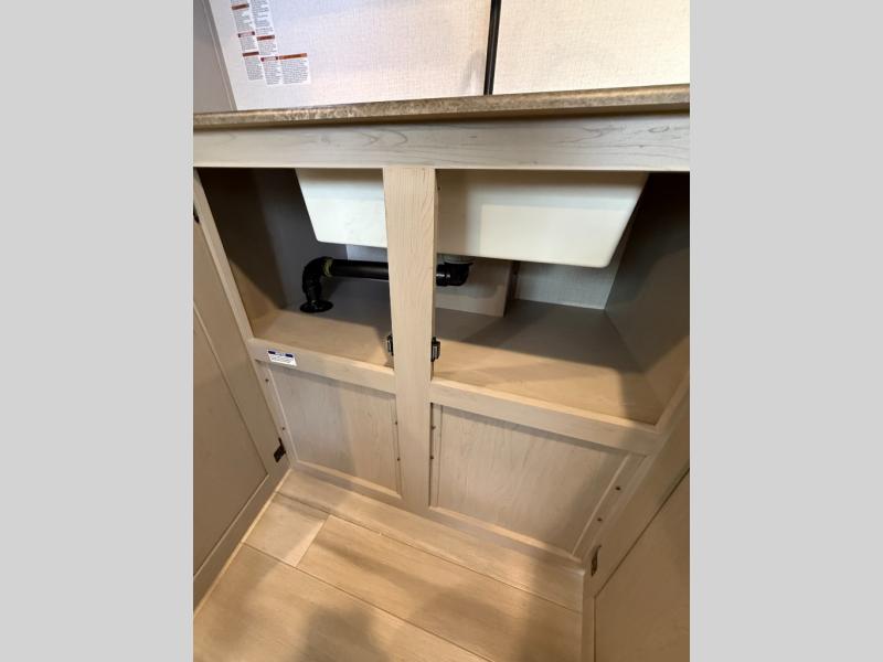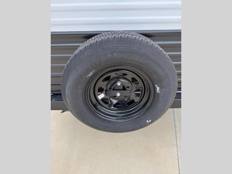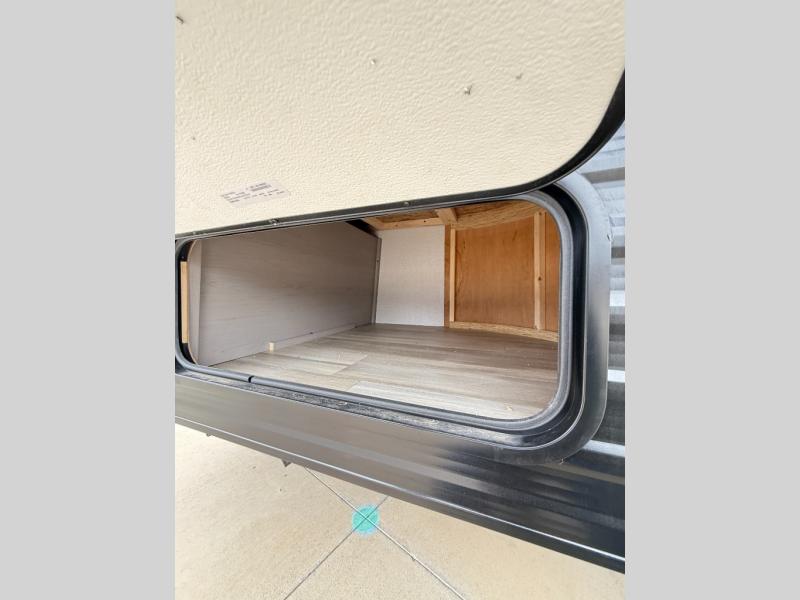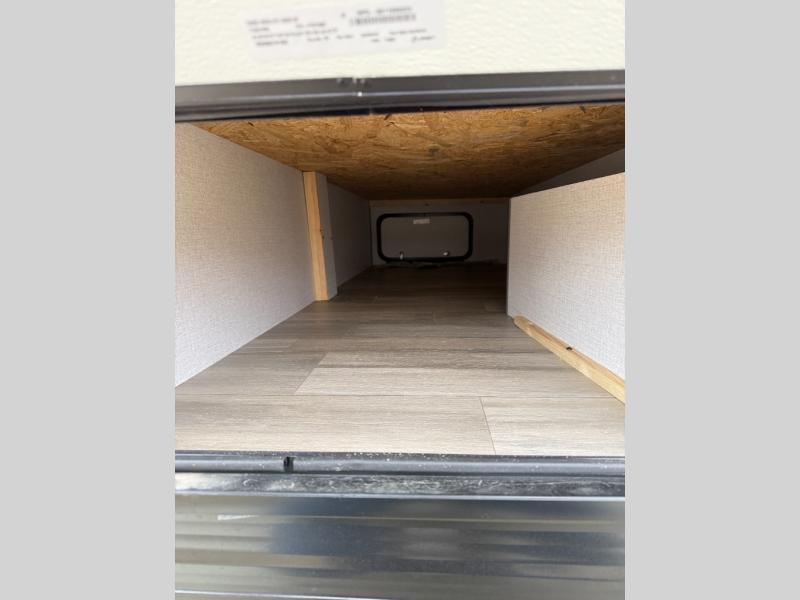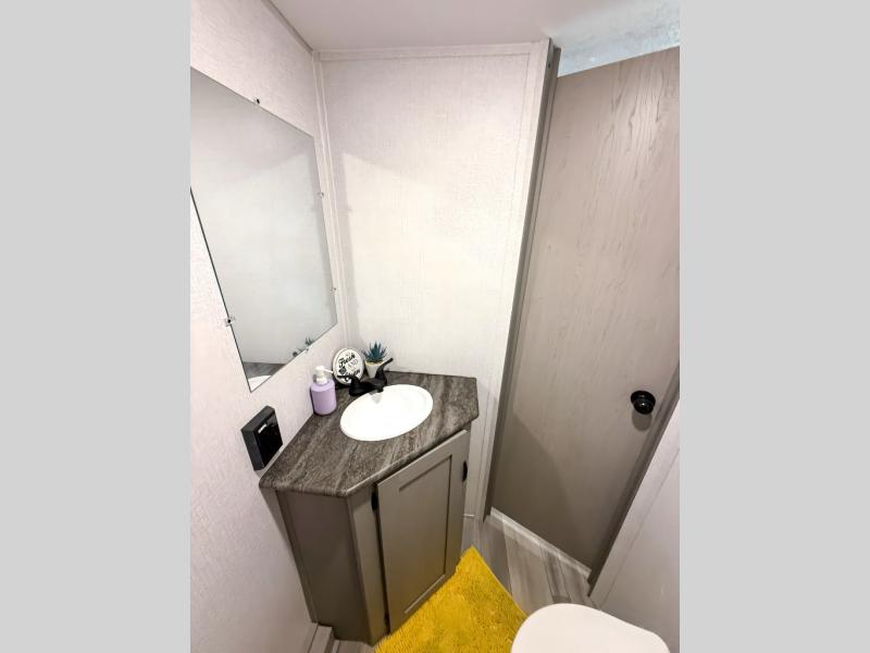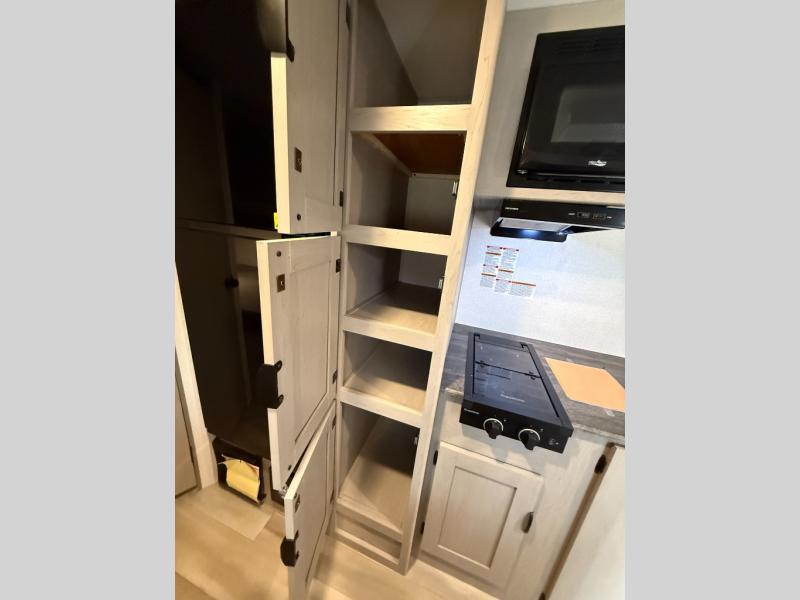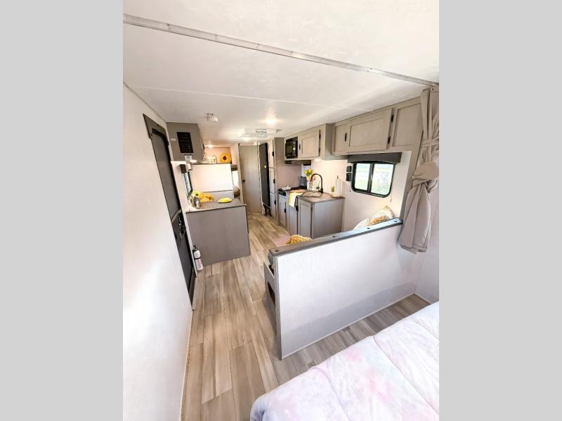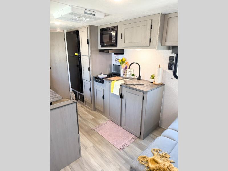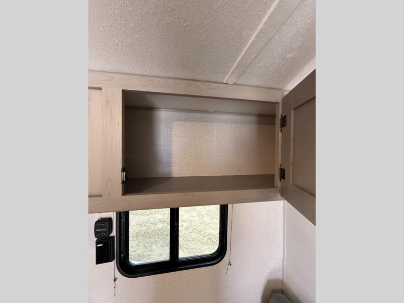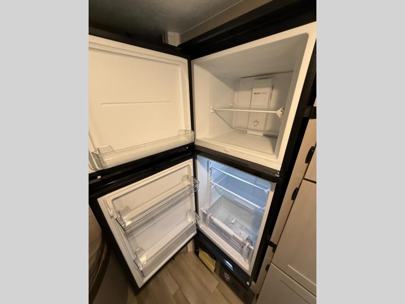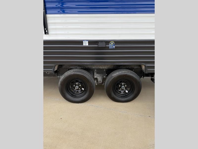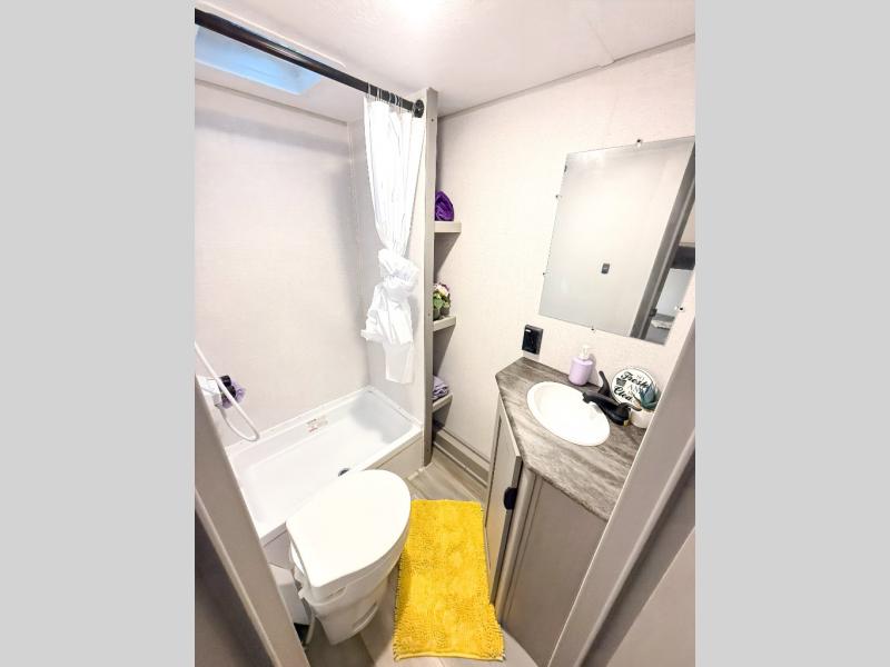 Bring the whole family with you in this travel trailer! The kiddos can sleep on the rear corner set of double bed bunks. The opposite rear corner features a full bath including a 24" x 36" shower, linen cabinet, toilet, and vanity with medicine cabinet overhead. In the main living space you will find plenty of seating with a booth dinette and jackknife sofa which can also transform into an extra sleeping space if needed. Everyone's bellies will stay full with the two burner cooktop, 11 cu. ft. 12-volt refrigerator, and microwave which you can use to pop a bag of popcorn for movie night. You will enjoy the front bedroom for a bit of privacy including a queen bed and large overhead cabinet for your things. On the outside, a large front pass-through for lawn chairs and camp gear. There is more storage beneath the double bed bunks in back and a nice 10' awning to provide protection from the elements when outdoors.