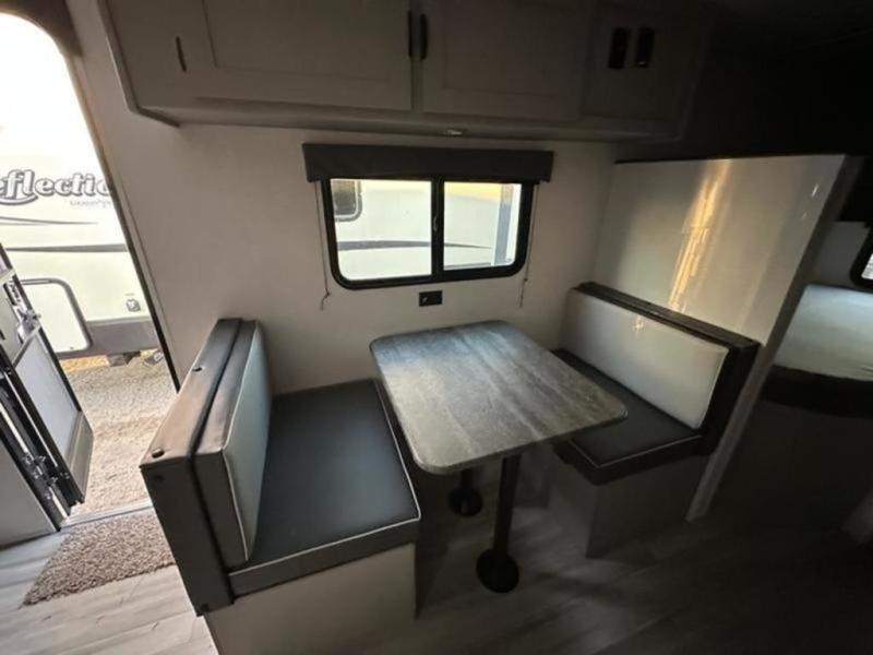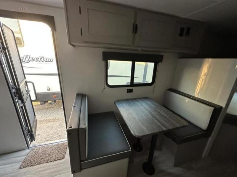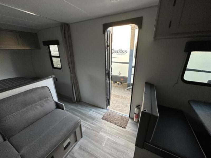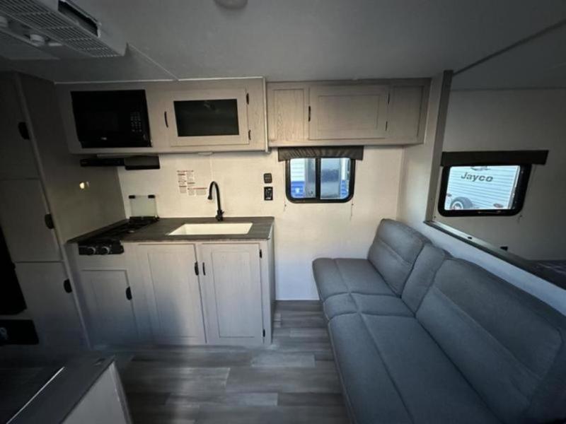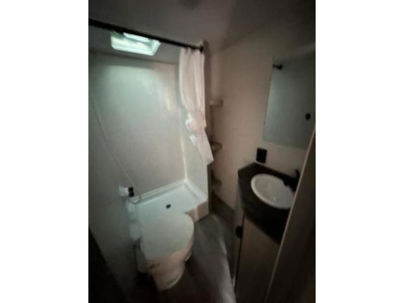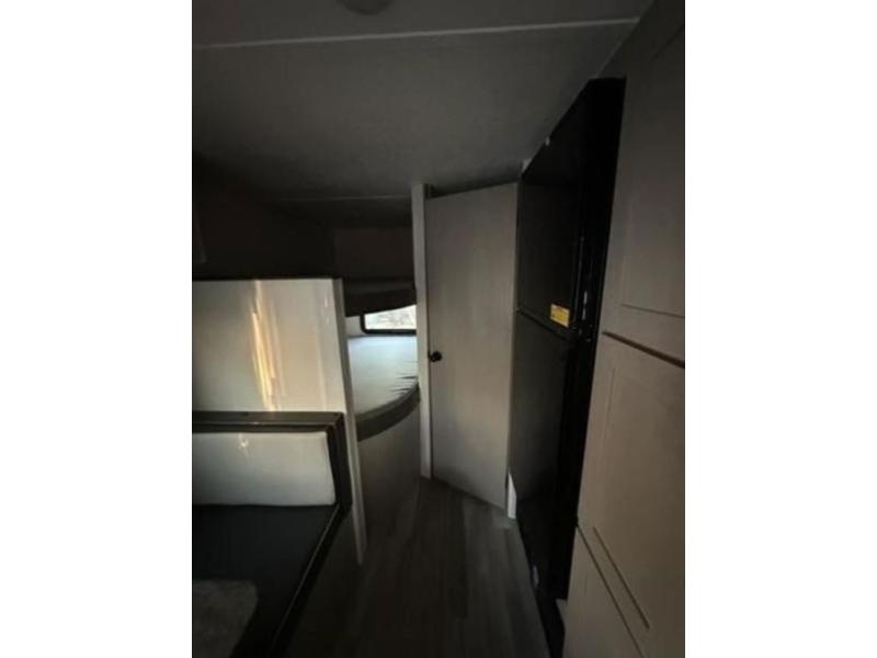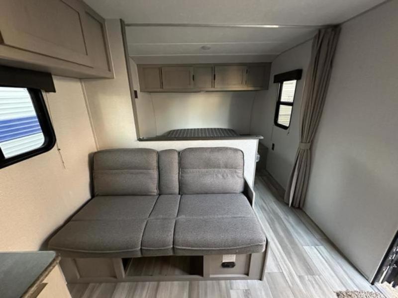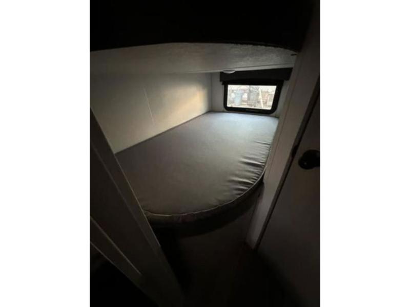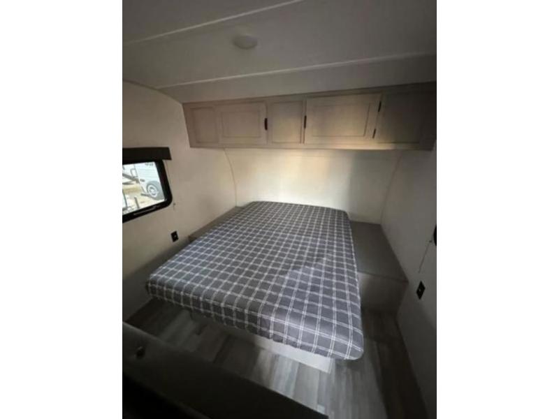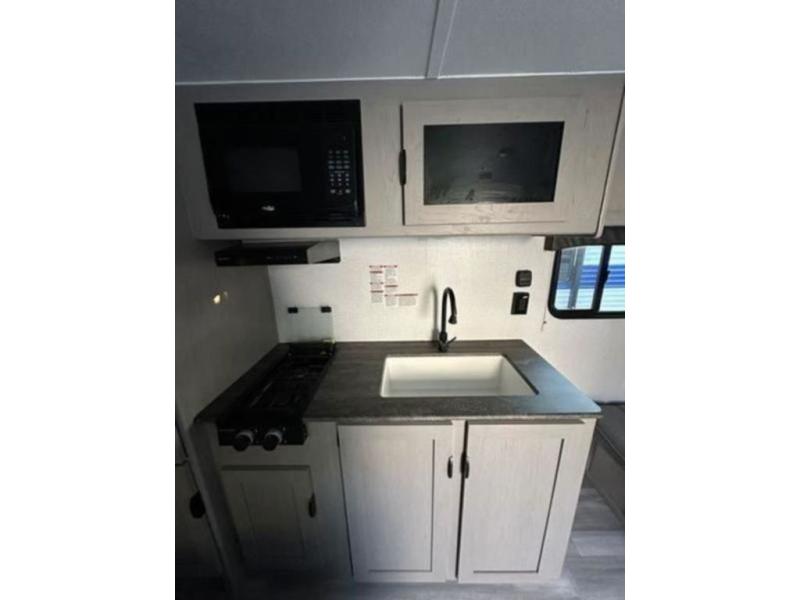 Bring the whole family with you in this travel trailer! The kiddos can sleep on the rear corner set of double bed bunks. The opposite rear corner features a full bath including a 24" x 36" shower, linen cabinet, toilet, and vanity with medicine cabinet overhead. In the main living space you will find plenty of seating with a booth dinette and jackknife sofa which can also transform into an extra sleeping space if needed. Everyone's bellies will stay full with the two burner cooktop, 11 cu. ft. 12-volt refrigerator, and microwave which you can use to pop a bag of popcorn for movie night. You will enjoy the front bedroom for a bit of privacy including a queen bed and large overhead cabinet for your things. On the outside, a large front pass-through for lawn chairs and camp gear. There is more storage beneath the double bed bunks in back and a nice 10' awning to provide protection from the elements when outdoors.