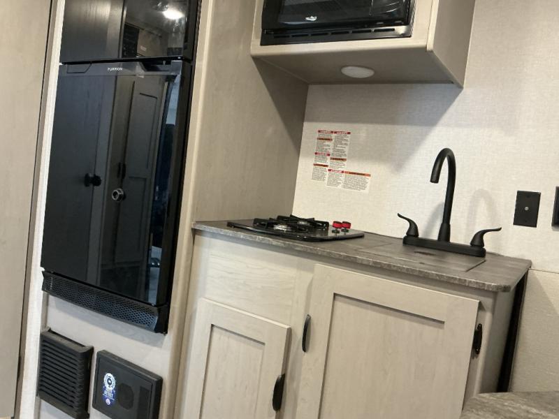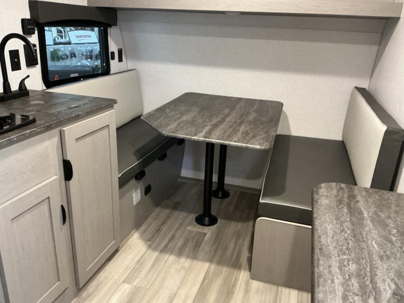 Tired of tent camping and sleeping on the ground? Well, this Clipper Cadet lightweight travel trailer can accommodate you nicely with a dry and comfortable place to stay while enjoying nature. Inside, you will find a booth dinette for plenty of space to sit and stretch your legs, or enjoy a meal. The booth dinette easily converts to a queen size sleeping space at night. You might also enjoy your morning breakfast or coffee at the bar top with two stools. A 24" x 36" shower and toilet provide a convenience to your camping trips, no late nights running to the campground bathroom in the dark. And, the kitchen features a two burner cooktop and refrigerator so you can cook inside when you'd rather not deal with campfire smoke over an open fire. There is also plenty of storage for your things between the overhead cabinets and shelves, wardrobe/pantry near the door, and within exterior storage as well.