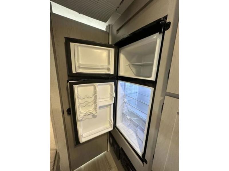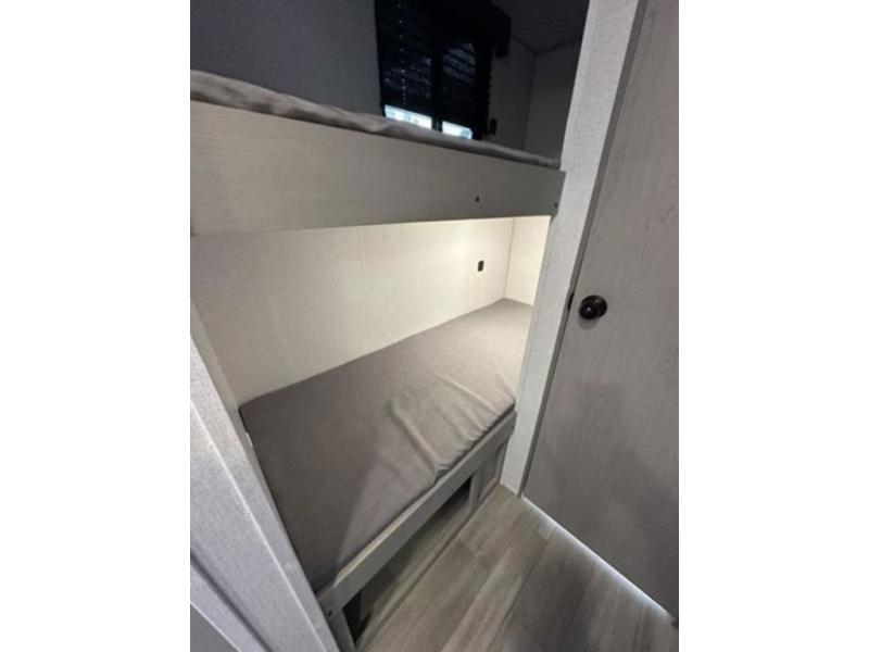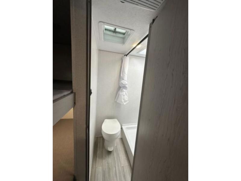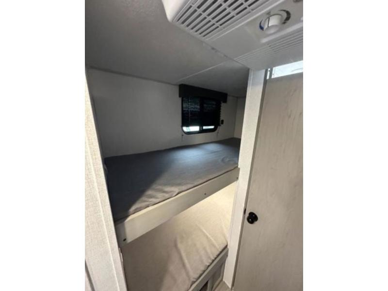 This Clipper Cadet bunk model is perfect for your growing family of three or four. In front, a booth dinette with large overhead shelf is great for dining during the day, and can easily be converted to queen bed size sleeping space for two. A countertop with cabinet storage beneath are featured just inside the door on your left. The children will love the 28" x 72" bunk beds and a convenient corner bath with toilet and 24" x 36" shower is right nearby for late night trips. Cook up family meals with the two burner cook-top easily inside when you don't feel like cooking over an open campfire There is a single sink, pantry, and refrigerator for your perishables as well. On the outside, a 9' awning provides more living space to enjoy, and there is exterior storage both up front and in back beneath the awning for camp chairs and outside toys and games.